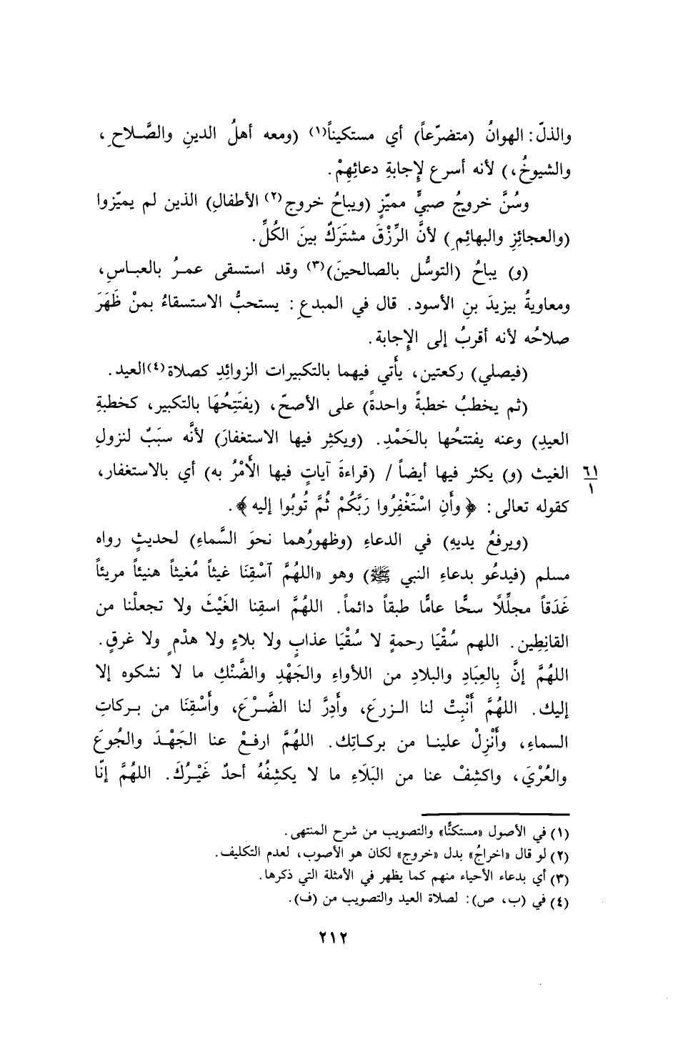 (ويرفعُ يديهِ) في الدعاءِ (وظهورُهما نحوَ السَّماءِ) لحديثٍ رواه مسلم (فيدعُو بدعاءِ النبي - صلى الله عليه وسلم -) وهو "اللهُم اسْقِنَا غيثاً مُغيثاً هنيئاً مريئاً غَدَقاً مجلِّلاً سحًّا عامًّا طبقاً دائماً. اللَّهُم اسقِنا الغَيْثَ ولا تجعلْنا من القانِطِين. اللهم سُقْيَا رحمةٍ لا سُقْيَا عذابِ ولا بلاءٍ ولا هدْمِ ولا غرقٍ. اللهُمَّ إنَّ بِالعِبَادِ والبلادِ من اللأواءِ والجُهْدِ والضَّنْكِ ما لاَ نشكوه إلا إليك. اللهُمَّ أَنبِتْ لنا الزرعَ، وأَدِرَّ لنا الضَّرْعَ، وأَسْقِنَا من بركاتِ السماءِ، وأَنْزِلْ علينا من بركاتِك. اللهُمَّ ارفعْ عنا الجَهْدَ والجُوعَ والعُرْيَ، واكشِفْ عنا من البَلَاءِ ما لا يكشِفُة أحدٌ غَيْرُكَ. اللَّهُمَّ إنّا