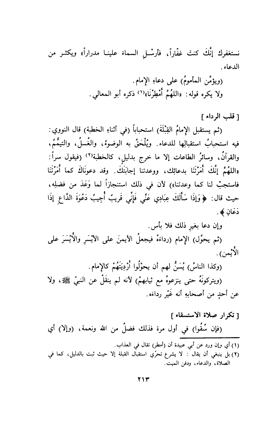 (ثم يستقبل الإِمامُ القِبْلَةَ) استحباباً (في أثناءِ الخطبة) قال النووي: فيه استحبابُ استقبالِها للدعاء. وُيلْحَقُ به الوضوء، والغُسلُ، والتيمُّمُ، والقرآنُ، وسائرُ الطاعات إلا ما خرج بدليلٍ، كالخطبة (¬2) (فيقول سراً: "اللهُمَّ إنَّكَ أمرْتَنَا بدعائِك، ووعدتنا إجابَتَكَ. وقد دعونَاكَ كما أَمرْتَنَا فاستجبْ لنا كما وعدتنا") لأن في ذلك استنجازاً لما وَعَدَ من فضلِه، حيث قال: {وَإِذَا سَأَلَكَ عِبَادِي عَنِّي فَإِنِّي قَرِيبٌ أُجِيبُ دَعْوَةَ الدَّاعِ إِذَا دَعَانِ}.