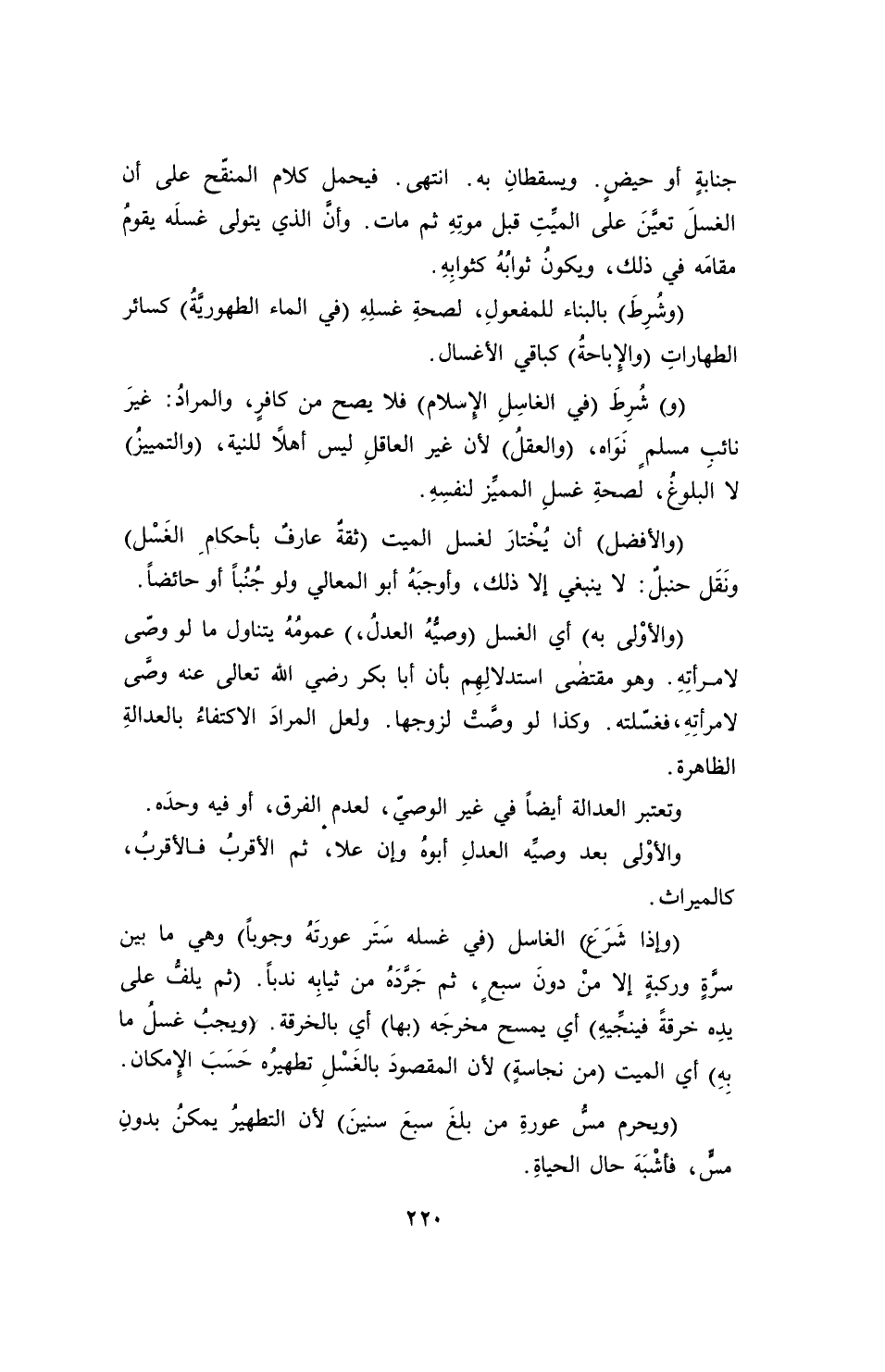(والأوْلى به) أي الغسل (وصيُّهُ العدلُ،) عمومُهُ يتناول ما لو وصّى لامرأتِهِ. وهو مقتضى استدلالِهِم بأن أبا بكر رضي الله تعالى عنه وصَّى لامرأتِهِ، فغسّلته. وكذا لو وصَّتْ لزوجها. ولعل المرادَ الاكتفاءُ بالعدالةِ الظاهرة.