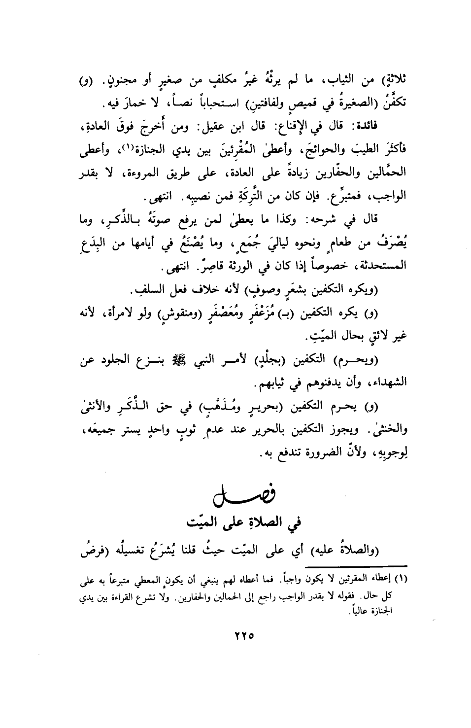 (¬1) إعطاء المقرئين لا يكون واجباً. فما أعطاه لهم ينبغي أن يكون المعطي متبرعاً به على كل حال. فقوله لا بقدر الواجب راجع إلى الحمالين والحفارين. ولا تشرع القراءة بين يدي الجنازة عالياً.