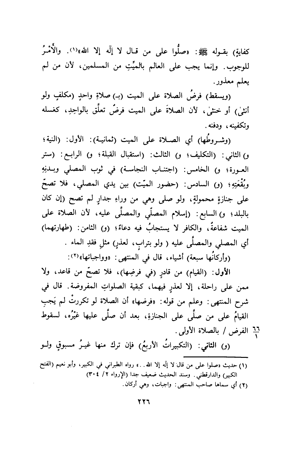 (وشروطُها) أي الصلاة على الميت (ثمانية): الأول: (النية؛ و) الثاني: (التكليف؛ و) الثالث: (استقبال القبلة؛ و) الرابع: (ستر العورة؛ و) الخامس: (اجتناب النجاسة) في ثوب المصلي وبدنِهِ وبُقْعَتِهِ؛ (و) السادس: (حضور الميّت) بين يدي المصلي، فلا تصحّ على جنازةٍ محمولةٍ، ولو صلى وهي من وراءِ جدارٍ لم تصح (إن كان بالبلد؛ و) السابع: (إسلام المصلّي والمصلِّى عليه، لأن الصلاة على الميت شفاعةٌ، والكافر لا يستجابُ فيه دعاءٌ؛ (و) الثامن: (طهارتهما) أي المصلي والمصلَّى عليه (ولو بترابِ، لعذر) مثلِ فقدِ الماء.