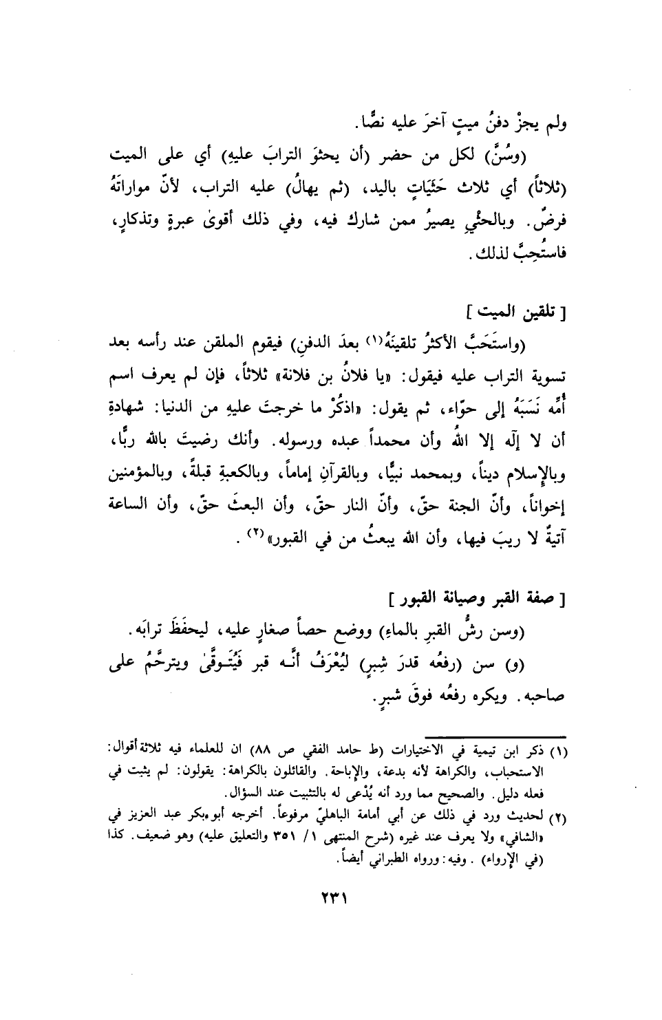 (واستَحَبَّ الأكثرُ تلقينَهُ (¬1) بعدَ الدفنِ) فيقوم الملقن عند رأسه بعد تسوية التراب عليه فيقول: "يا فلانُ بن فلانة" ثلاثاً، فإن لم يعرف اسم أُمِّه نَسَبَهُ إلى حوّاء، ثم يقول: "اذكُرْ ما خرجتَ عليهِ من الدنيا: شهادةِ أن لا إله إلا الله وأن محمداً عبده ورسوله. وأنك رضيتَ بالله ربًّا، وبالإِسلام ديناً، وبمحمد نبيًّا، وبالقرآنِ إماماً، وبالكعبةِ قبلةً، وبالمؤمنين إخواناً، وأنّ الجنة حقّ، وأنّ النار حقّ، وأن البعثَ حقّ، وأن الساعة آتيةُ لا ريبَ فيها، وأن الله يبعثُ من في القبور" (¬2).