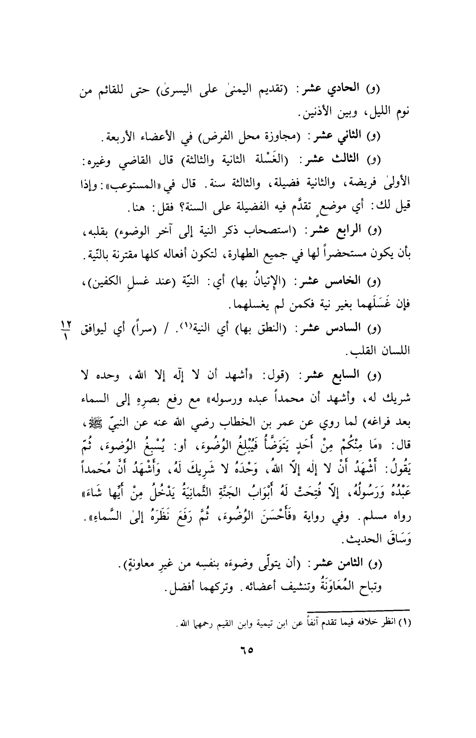 (و) السابع عشر: (قول: "أشهد أن لا إله إلا الله، وحده لا شريك له، وأشهد أن محمداً عبده ورسوله" مع رفع بصرِهِ إلى السماء بعد فراغه) لما روي عن عمر بن الخطاب رضي الله عنه عن النبيّ - صلى الله عليه وسلم -، قال: "مَا مِنْكًمْ مِنْ أحَدٍ يَتَوَضَّأُ فَيُبْلِغُ الوُضوءَ، أو: يسْبغُ الوُضوءَ، ثُمّ يَقُولُ: أشْهَدُ أنْ لا إله إلاَّ الله، وَحْدَهُ لا شَرِيكَ لَه، وَأشْهَدُ أن مُحَمداً عَبْدُهُ وَرَسُولُهُ، إلاَّ فُتِحَت لَهُ أبْوَابُ الجَنَةِ الثَّمانِيَةُ يَدْخُلُ مِنْ أيِّها شَاءَ" رواه مسلم. وفي رواية "فَأحْسَنَ الوُضُوءَ، ثُمَّ رَفَعَ نَظَرَهُ إلى السَّماءِ". وَسَاقَ الحديث.