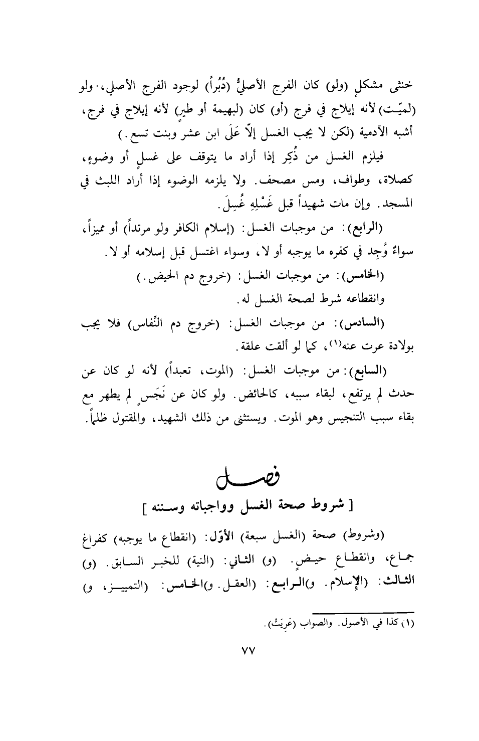 (وشروط) صحة (الغسل سبعة) الأول: (انقطاع ما يوجبه) كفراغ جماع، وانقطاعِ حيضٍ. (و) الثاني: (النية) للخبر السابق. (و) الثالث: (الإِسلام. و) الرابع: (العقل. و) الخامس: (التمييز، و)