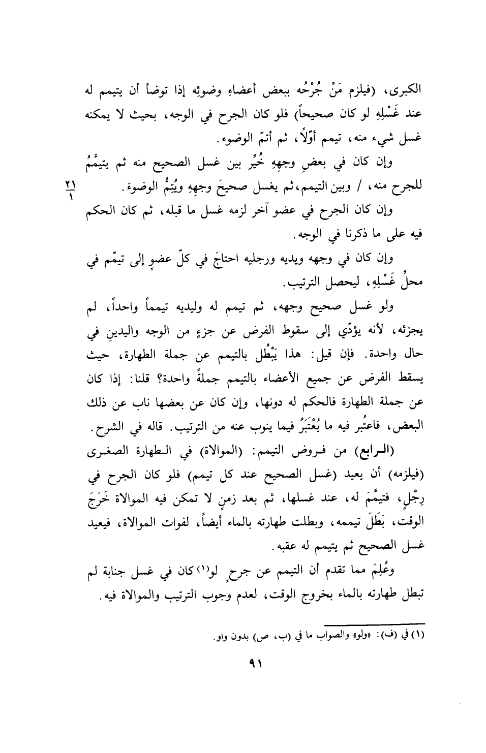 الكبرى، (فيلزم مَنْ جُرْحُه ببعض أعضاءِ وضوئِه إذا توضأ أن يتيمم له عند غَسْلِهِ لو كان صحيحاً) فلو كان الجرح في الوجه، بحيث لا يمكنه غسل شيء منه, تيمم أوّلاً، ثم أتمّ الوضوء.