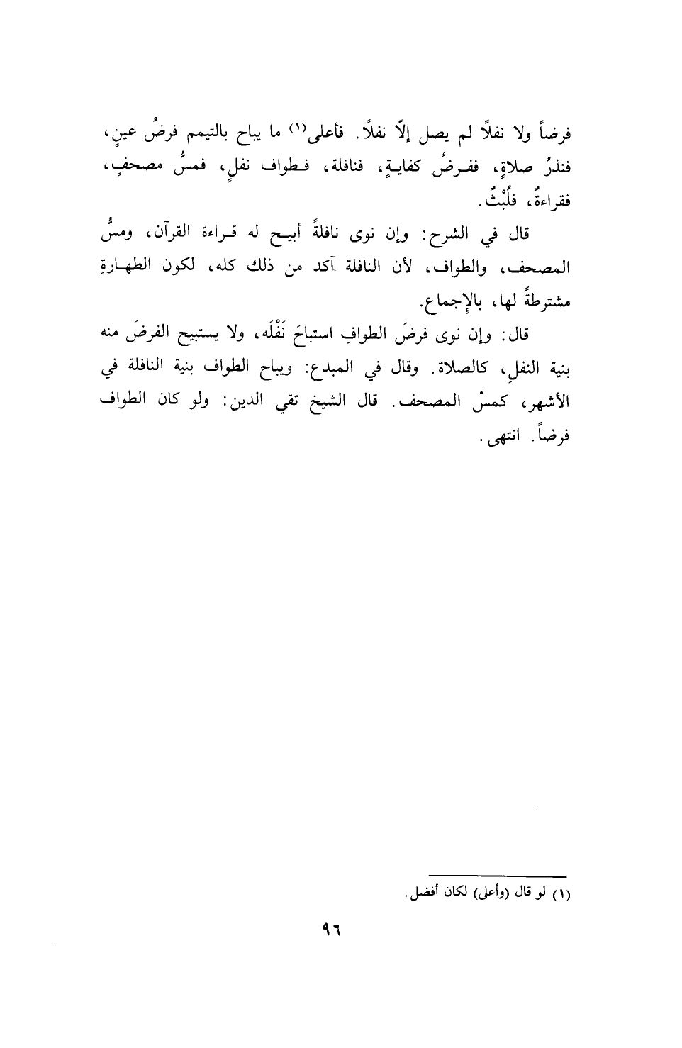 فرضاً ولا نفلاً لم يصل إلاَّ نفلاً. فأعلى (¬1) ما يباح بالتيمم فرضُ عينٍ، فنذرُ صلاةٍ، ففرضُ كفايةٍ، فنافلة، فطواف نفلٍ، فمسُّ مصحفٍ، فقراءةٌ، فلُبْثٌ.