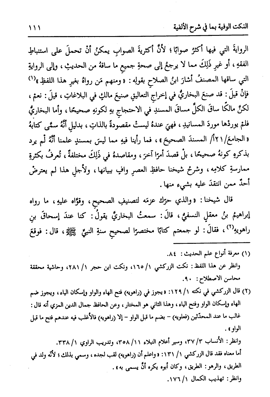 (¬2) قال الزركشي في نكته 1/ 129: ((يجوز في (راهويه) فتح الهاء والواو وإسكان الياء، ويجوز ضم الهاء وإسكان الواو وفتح الياء، وهذا الثاني هو المختار، وعن الحافظ جمال الدين المزي أنه قال: غالب ما عند المحدّثين (فعلويه) -بضم ما قبل الواو - إلا (راهويه) فالأغلب فيه عندهم فتح ما قبل الواو)). وانظر: الأنساب 3/ 37، وسير أعلام النبلاء 11/ 358، وتدريب الراوي 1/ 338.