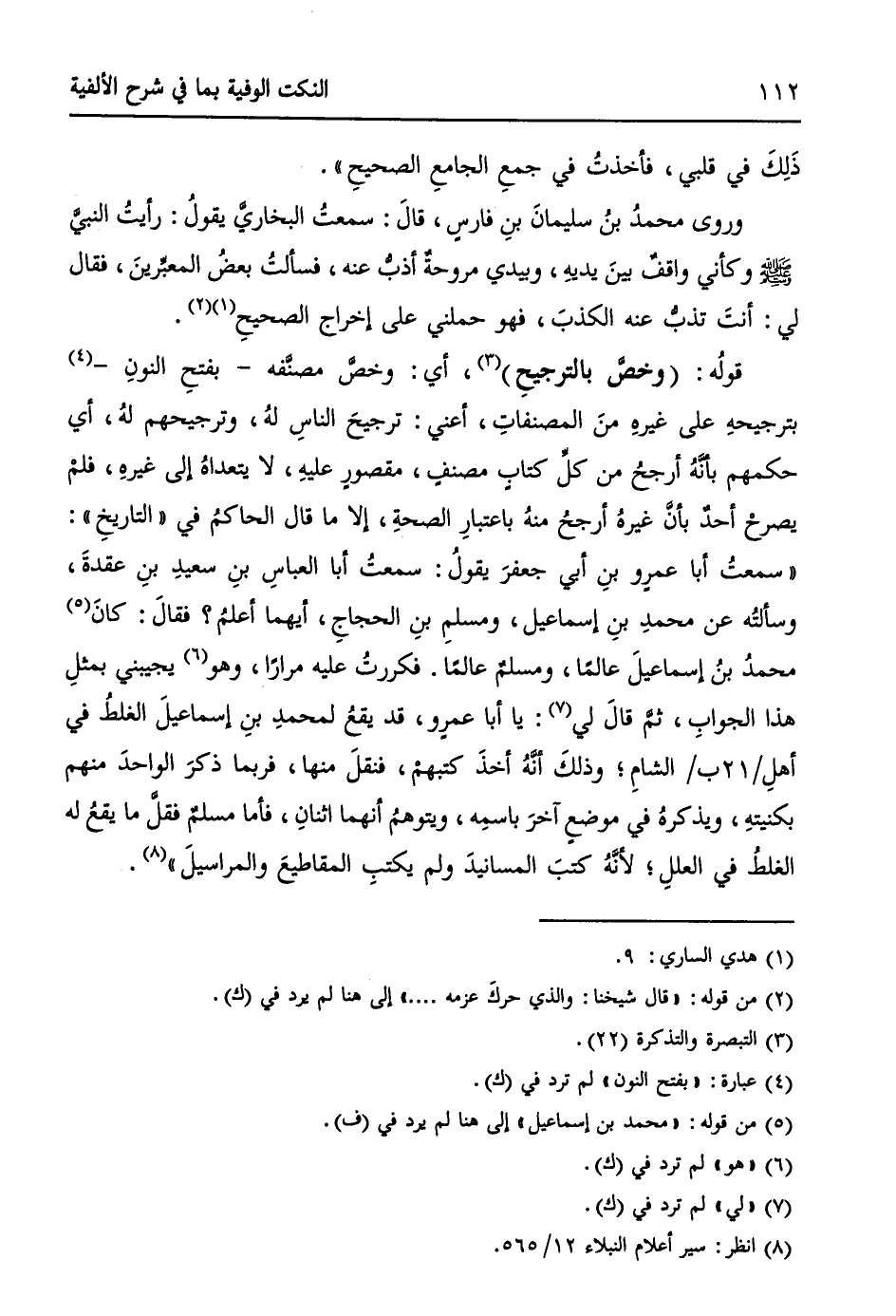 قولهُ: (وخصَّ بالترجيحِ) (¬3)، أي: وخصَّ مصنَّفهُ - بفتحِ النونِ - (¬4) بترجيحهِ على غيرهِ منَ المصنفاتِ، أعني: ترجيحَ الناسِ لهُ، وترجيحهمْ لهُ، أي حكمهم بأنَّهُ أرجحُ من كلِّ كتابٍ مصنفٍ، مقصورٍ عليهِ، لا يتعداهُ إلى غيرهِ، فلمْ يصرحْ أحدٌ بأنَّ غيرهُ أرجحُ منهُ باعتبارِ الصحةِ، إلا ما قالَ الحاكمُ في " التاريخِ ": ((سمعتُ أبا عمرٍو بنِ أبي جعفرَ يقولُ: سمعتُ أبا العباسِ بنِ سعيدِ بنِ عقدةَ، وسألتهُ عنْ محمدِ بنِ إسماعيل، ومسلمِ بنِ الحجاجِ، أيهما أعلمُ؟ فقالَ: كانَ (¬5) محمدُ بنُ إسماعيلَ عالماً، ومسلمٌ عالمٌ. فكررتُ عليهِ مراراً، وهو (¬6) يجيبني بمثلِ هذا الجوابِ، ثمَّ قالَ لي (¬7): يا أبا عمرٍو، قد يقعُ لمحمدِ بنِ إسماعيلَ الغلطُ في أهلِ / 21ب / الشامِ؛ وذلكَ أنَّهُ أخذَ كتبهمْ، فنقلَ منها، فربما ذكرَ الواحدَ منهم بكنيتهِ، ويذكرهُ في موضعٍ آخرَ باسمهِ، ويتوهمُ أنهما اثنانِ، فأما مسلمٌ فقلَّ ما يقعُ لهُ الغلطُ في العللِ؛ لأنَّهُ كتبَ المسانيدَ ولمْ يكتبِ المقاطيعَ والمراسيلَ)) (¬8).