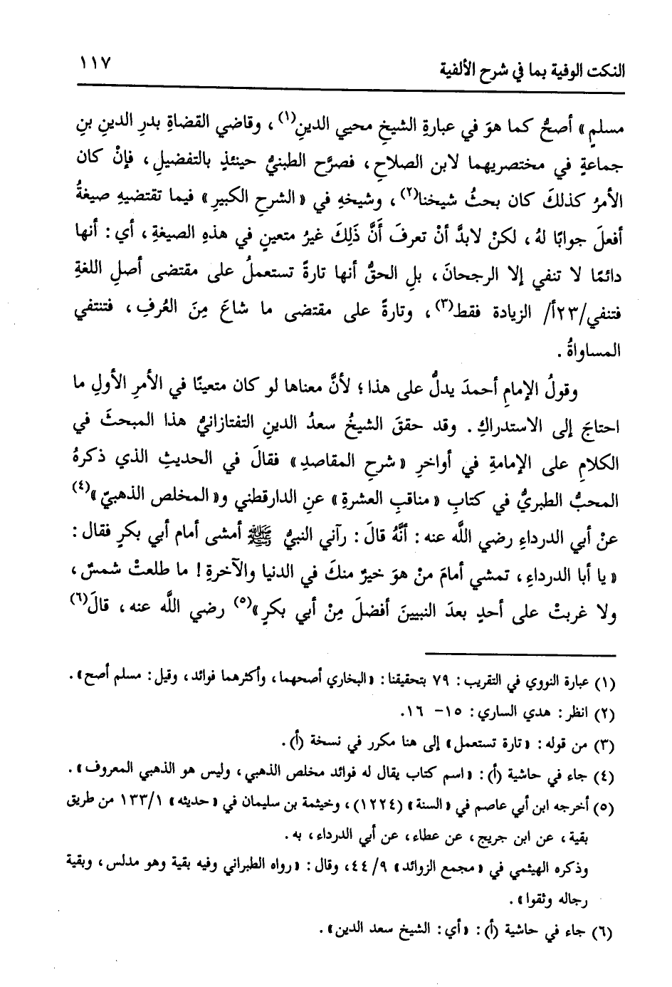 وقولُ الإمامِ أحمدَ يدلُ على هذا؛ لأنَّ معناها لو كانَ متعيناً في الأمرِ الأولِ ما احتاجَ إلى الاستدراكِ. وقد حققَ الشيخُ سعدُ الدينِ التفتازانيُّ هذا المبحثَ في الكلامِ على الإمامةِ في أواخرِ "شرحِ المقاصدِ" فقالَ في الحديثِ الذي ذكرهُ المحبُ الطبريُّ في كتابِ " مناقبِ العشرةِ " عنِ الدارقطني و"المخلص الذهبيّ " (¬4) عنْ أبي الدرداءِ - رضي الله عنه -: أنَّهُ قالَ: رآني النبيُّ - صلى الله عليه وسلم - أمشي أمام أبي بكرٍ فقالَ: ((يا أبا الدرداءِ، تمشي أمامَ منْ هوَ خيرٌ منكَ في الدنيا والآخرةِ! ما طلعتْ شمسٌ، ولا غربتْ على أحدٍ بعدَ النبيينَ -أفضل مِنْ أبي بكرٍ)) (¬5) - رضي الله عنه -، قالَ (¬6)