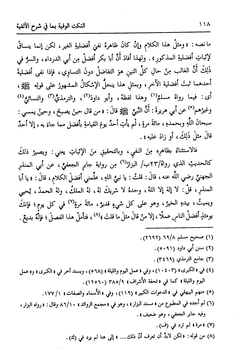 ما نصهُ: ((ومثلُ هذا الكلامِ وإنْ كانَ ظاهرهُ نفيَ أفضليةِ الغير، لكنْ إنما ينساقُ لإثباتِ أفضليةِ المذكورِ)). ولهذا أفادَ أَنَّ أبا بكر أفضلُ مِنْ أبي الدرداء، والسر في ذَلِكَ أَنَّ الغالب مِنْ حالِ كلِّ اثنينِ هوَ التفاضلُ دونَ التساوي، فإذا نفى أفضليةَ أحدهما ثبتَ أفضلية الآخرِ، وبمثلِ هذا ينحلُّ الإشكالُ المشهورُ على قولهِ - صلى الله عليه وسلم -، أي: فيما رواهُ مسلمٌ (¬1) وهذا لفظهُ، وأبو داودَ (¬2)، والترمذيُّ (¬3) والنسائيُّ (¬4) وغيرُهم (¬5) عن أبي هريرةَ: أَنَّ النَّبيَّ - صلى الله عليه وسلم - قالَ: ((منْ قالَ حينَ يصبحُ، وحينُ يمسي: سبحانَ اللهِ وبحمدهِ، مئةَ مرةٍ، لمْ يأتِ أحدٌ يومَ القيامةِ بأفضل مما جاءَ بهِ، إلا أحدٌ قالَ مثلَ ذَلِكَ، أو زادَ عليهِ)).