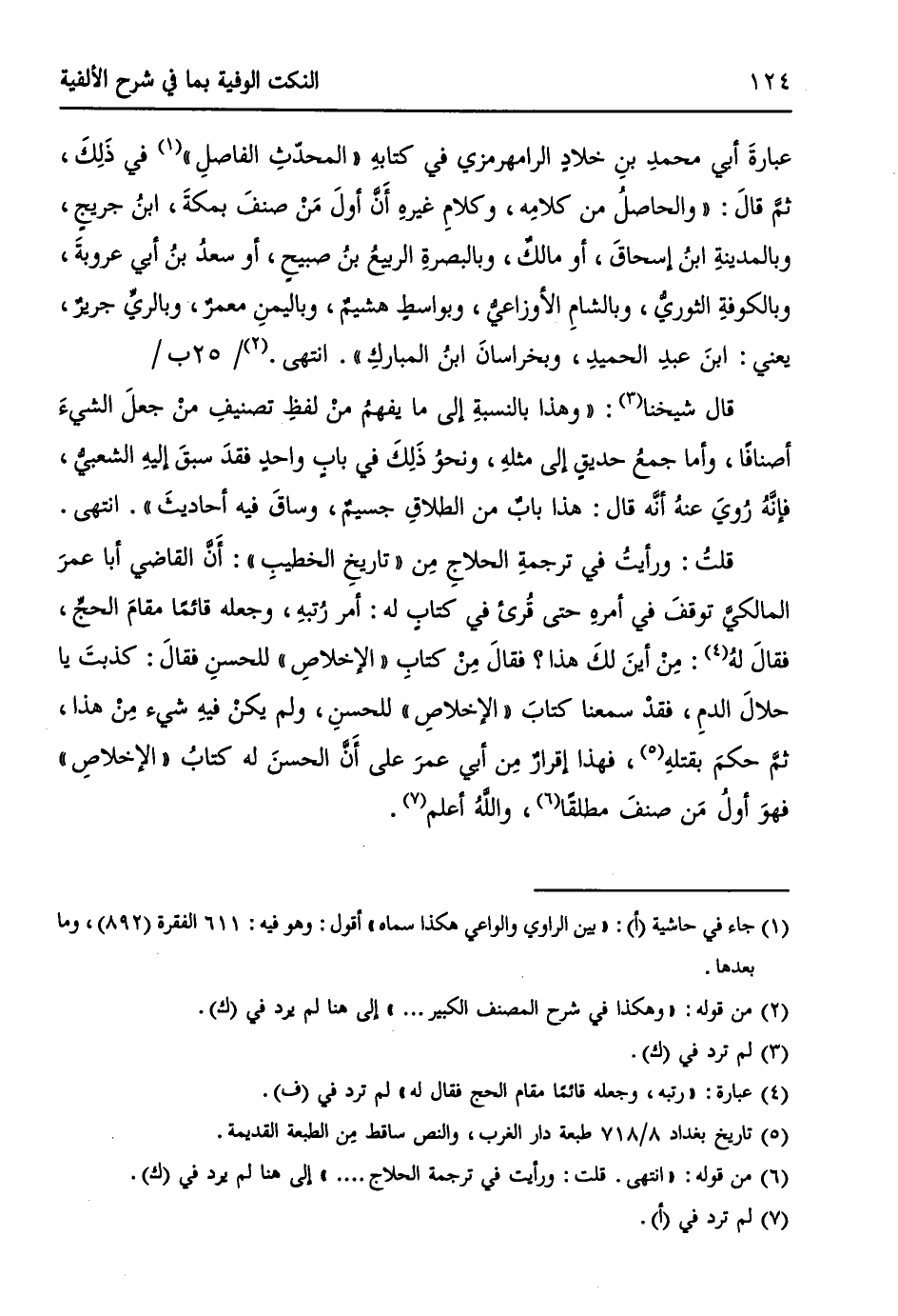 عبارةَ أبي محمدِ بنِ خلادٍ الرامهرمزي في كتابهِ " المحدّثِ الفاصلِ " (¬1) في ذَلِكَ، ثمَّ قالَ: ((والحاصلُ من كلامهِ، وكلامِ غيرهِ أَنَّ أولَ مَنْ صنفَ بمكةَ، ابنُ جريجٍ، وبالمدينةِ ابنُ إسحاقَ، أو مالكٌ، وبالبصرةِ الربيعُ بنُ صبيحٍ، أو سعيدُ بنُ أبي عروبةَ، وبالكوفةِ الثوريُّ، وبالشامِ الأوزاعيُّ، وبواسطٍ هشيمٌ، وباليمنِ معمرٌ، وبالريِّ جريرٌ، يعني: ابنَ عبدِ الحميدِ، وبخراسانَ ابنُ المباركِ)). انتهى. (¬2) / 25ب /