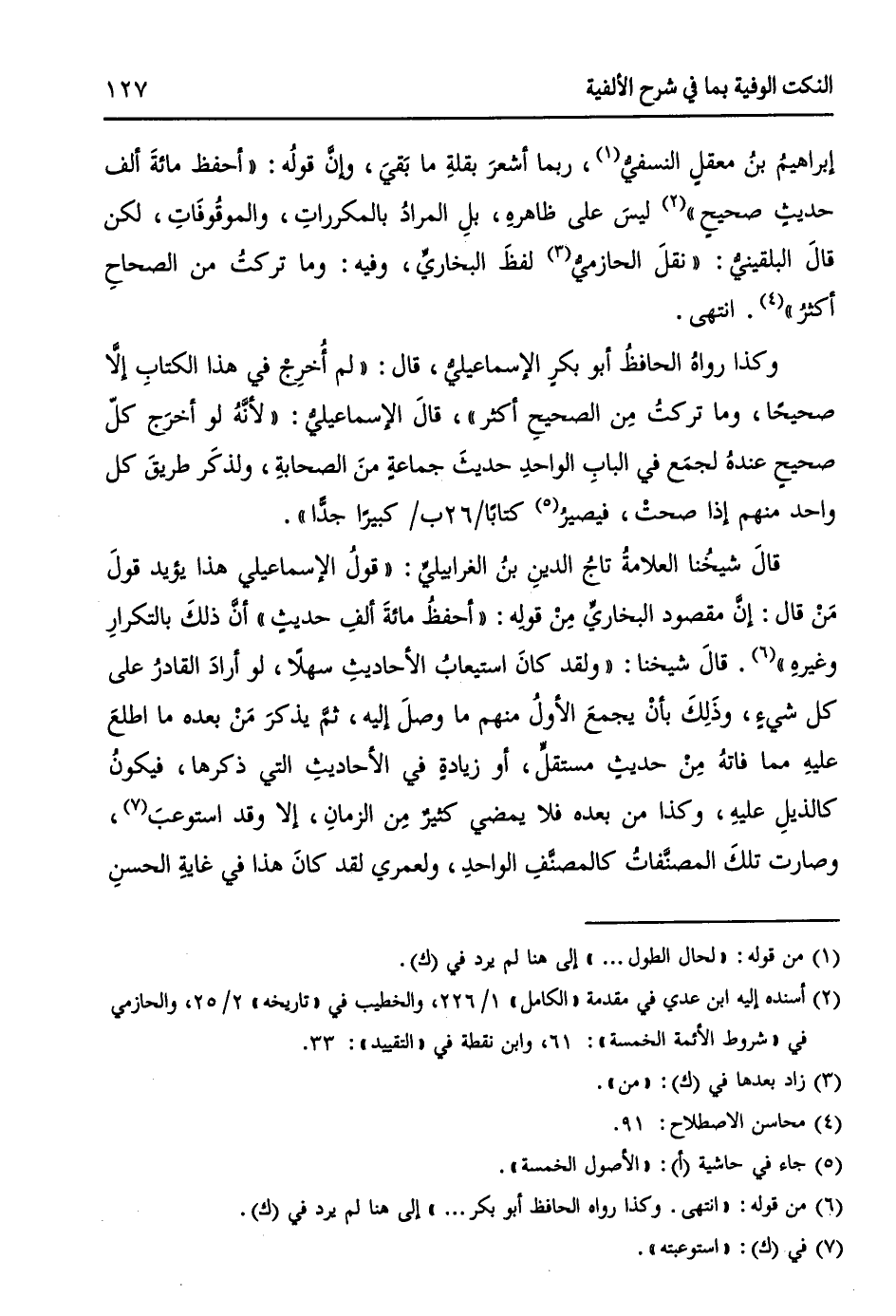 إبراهيمُ بنُ معقلٍ النسفيُّ (¬1)، ربما أشعرَ بقلةِ ما بَقيَ، وإنَّ قولهُ: ((أحفظ مئةَ إلف حديثٍ صحيحٍ)) (¬2) ليسَ على ظاهرهِ، بلِ المرادُ بالمكرراتِ، والموقُوفَاتِ، لكنْ قالَ البلقينيُّ: ((نقلَ الحازميُّ (¬3) لفظَ البخاريِّ، وفيهِ: وما تركتُ مِن الصحاحِ أكثرُ)) (¬4). انتهى.