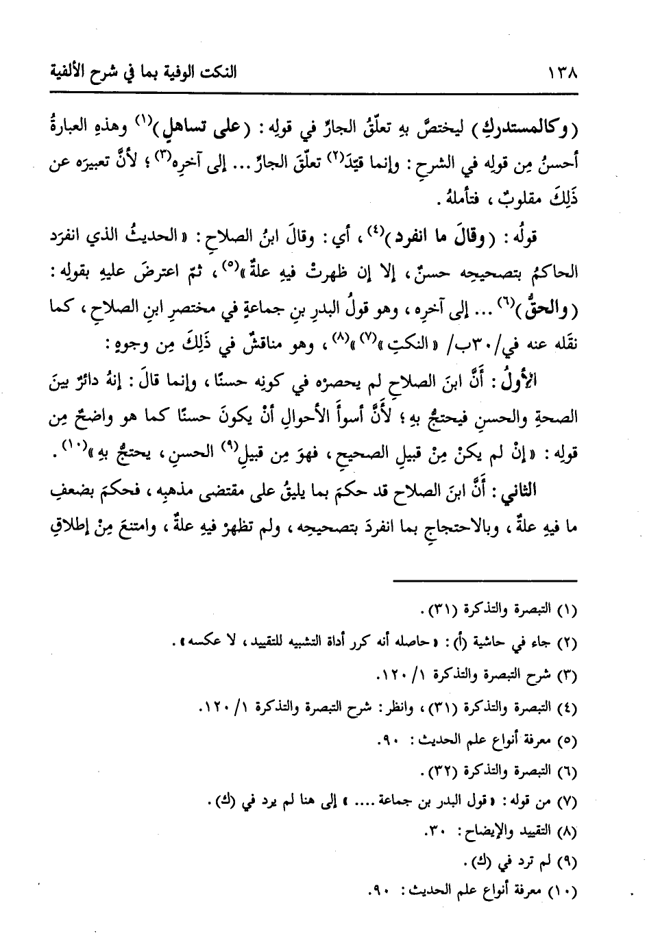 قولهُ: (وقالَ ما انفرد) (¬4)، أي: وقالَ ابنُ الصلاحِ: ((الحديثُ الذي انفردَ الحاكمُ بتصحيحهِ حسنٌ، إلا إن ظهرتْ فيهِ علةٌ)) (¬5)، ثمّ اعترضَ عليهِ بقولهِ: (والحقُ) (¬6) .. إلى آخرهِ، وهو قولُ البدرِ بنِ جماعةٍ في مختصرِ ابنِ الصلاحِ، كما نَقلهُ عنهُ في /30ب / "النكتِ (¬7) " (¬8)، وهو مناقشٌ في ذَلِكَ مِنْ وجوهٍ:
