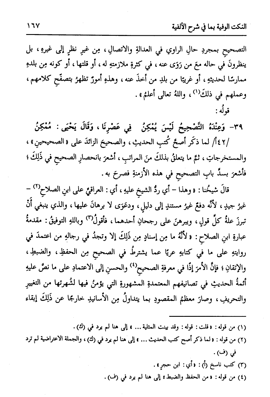 قالَ شيخُنا: ((وهذا - أي ردُّ الشيخِ عليهِ، أي: العراقيِّ على ابنِ الصلاحِ (¬2) - غيرُ جيدٍ، لأنَّهُ دفعٌ غيرُ مستندٍ إلى دليلٍ، ودعَوَى لا برهانَ عليها، والذي ينبغي أَنَّ تبرزَ علةُ كلِ قولٍ، ويبرهنَ على رجحانِ أحدهما، فأقولُ (¬3) وباللهِ التوفيقِ: مقدمةُ عبارةِ ابنِ الصلاحِ: ((لأنَّهُ ما مِنْ إسنادٍ مِنْ ذَلِكَ إلا وتجدُ في رجالهِ من اعتمدَ في روايتهِ على ما في كتابهِ عرياً عما يشترطُ في الصحيحِ مِن الحفظِ، والضبطِ، والإتقانِ؛ فإنَّ الأمرَ إذاً في معرفةِ الصحيحِ (¬4) والحسنِ إلى الاعتمادِ على ما نصَّ عليهِ أئمةُ الحديثِ في تصانيفهم المعتمدةِ المشهورةِ التي يؤمنُ فيها لشُهرتها منَ التغييرِ والتحريفِ، وصارَ معظمُ المقصودِ بما يتداولُ مِنَ الأسانيدِ خارجاً عن ذَلِكَ إبقاء