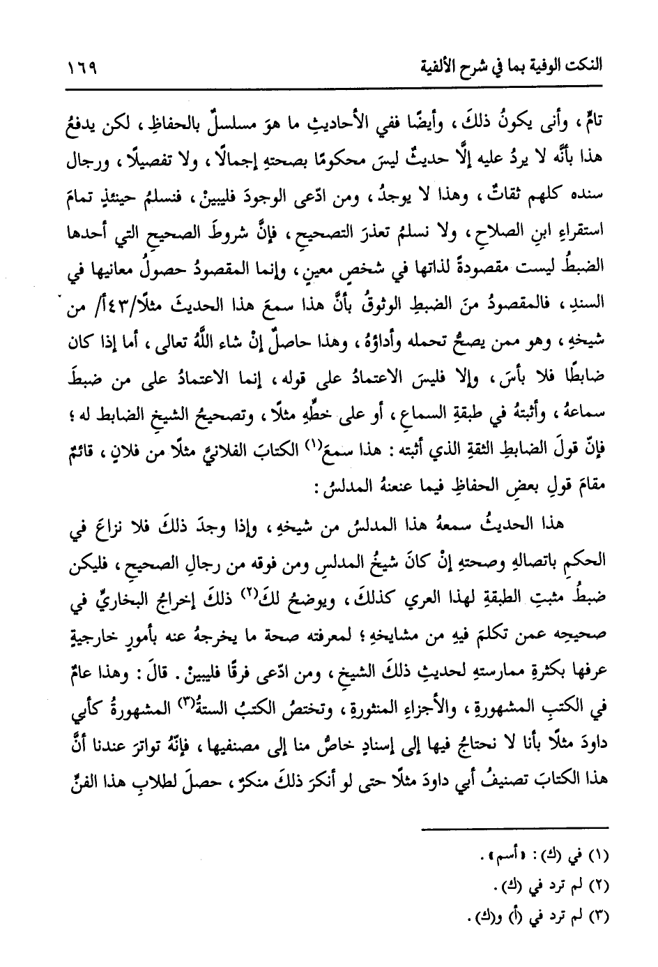 هذا الحديثُ سمعهُ هذا المدلسُ من شيخهِ، وإذا وجدَ ذلكَ فلا نزاعَ في الحكمِ باتصالهِ وصحتهِ إنْ كانَ شيخُ المدلسِ ومن فوقه من رجالِ الصحيحِ، فليكن ضبطُ مثبتِ الطبقةِ لهذا العري كذلكَ، ويوضحُ لكَ (¬2) ذلكَ إخراجُ البخاريِّ في صحيحهِ عمنْ تكلمَ فيهِ من مشايخهِ؛ لمعرفته صحة ما يخرجهُ عنه بأمورٍ خارجيةٍ عرفها بكثرةِ ممارستهِ لحديثِ ذلكَ الشيخِ، ومنِ ادّعى فرقاً فليبينْ. قالَ: وهذا عامٌ في الكتبِ المشهورةِ، والأجزاءِ المنثورةِ، وتختصُ الكتبُ الستةُ (¬3) المشهورةُ كأبي داودَ مثلاً بأنا لا نحتاجُ فيها إلى إسنادٍ خاصٍ منا إلى مصنفيها، فإنّهُ تواترَ عندنا أنَّ هذا الكتابَ تصنيفُ أبي داودَ مثلاً حتى لو أنكرَ ذلكَ منكرٌ، حصلَ لطلابِ هذا الفنِ