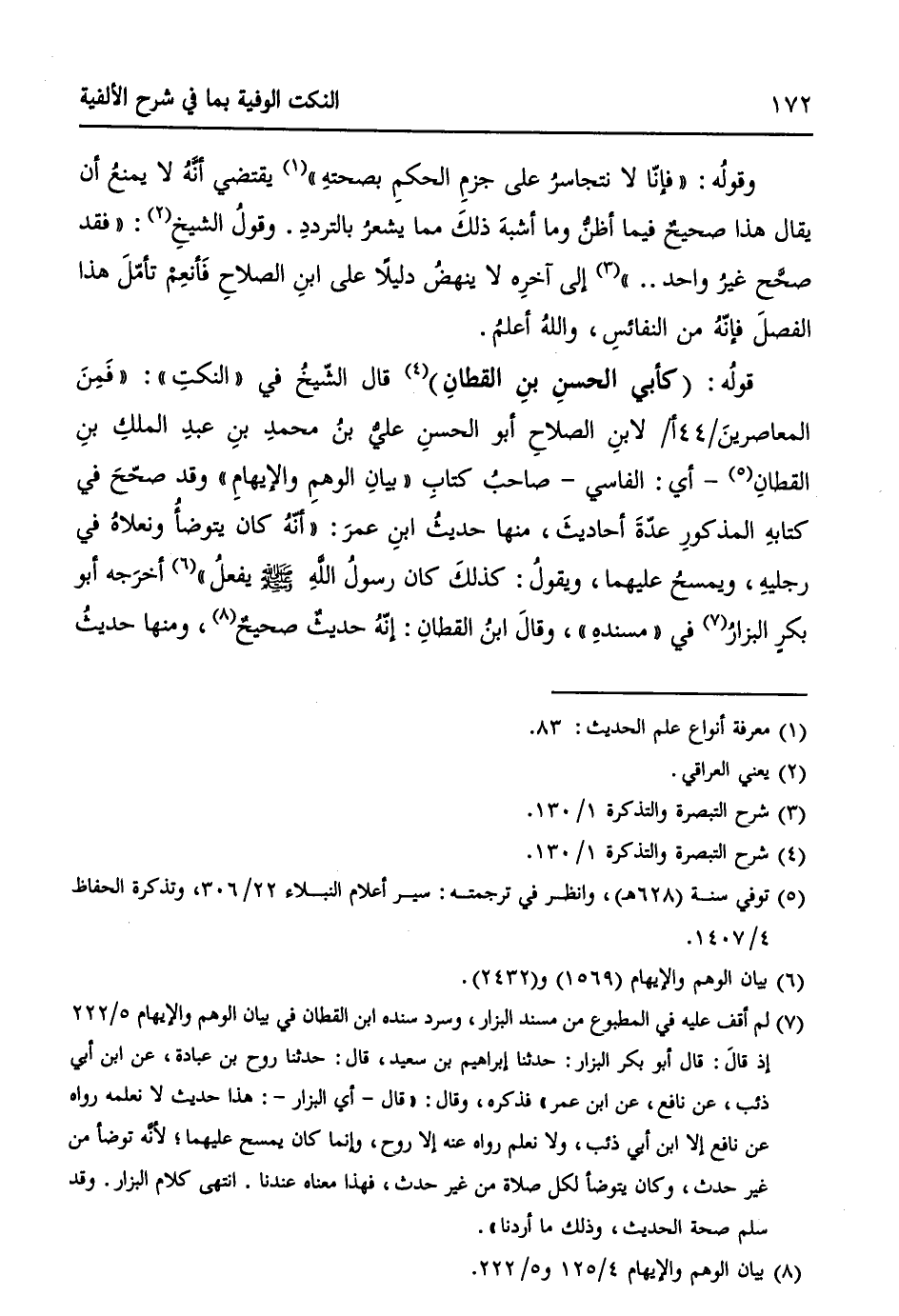 قولهُ: (كأبي الحسنِ بنِ القطانِ) (¬4) قالَ الشّيخُ في "النكتِ ": ((فَمِنَ المعاصرينَ / 44 أ / لابنِ الصلاحِ أبو الحسنِ عليُّ بنُ محمدِ بنِ عبدِ الملكِ بنِ القطانِ (¬5) - أي: الفاسي - صاحبُ كتابِ "بيانِ الوهمِ والإيهامِ " وقد صحّحَ في كتابهِ المذكورِ عدّةَ أحاديثَ، منها حديثُ ابنِ عمرَ: ((أنّهُ كان يتوضأُ ونعلاهُ في رجليهِ، ويمسحُ عليهما، ويقولُ: كذلكَ كان رسولُ اللهِ - صلى الله عليه وسلم - يفعلُ)) (¬6) أخرجهُ أبو بكرٍ البزارُ (¬7) في "مسندهِ"، وقالَ ابنُ القطانِ: إنّهُ حديثٌ صحيحٌ (¬8)، ومنها حديثُ