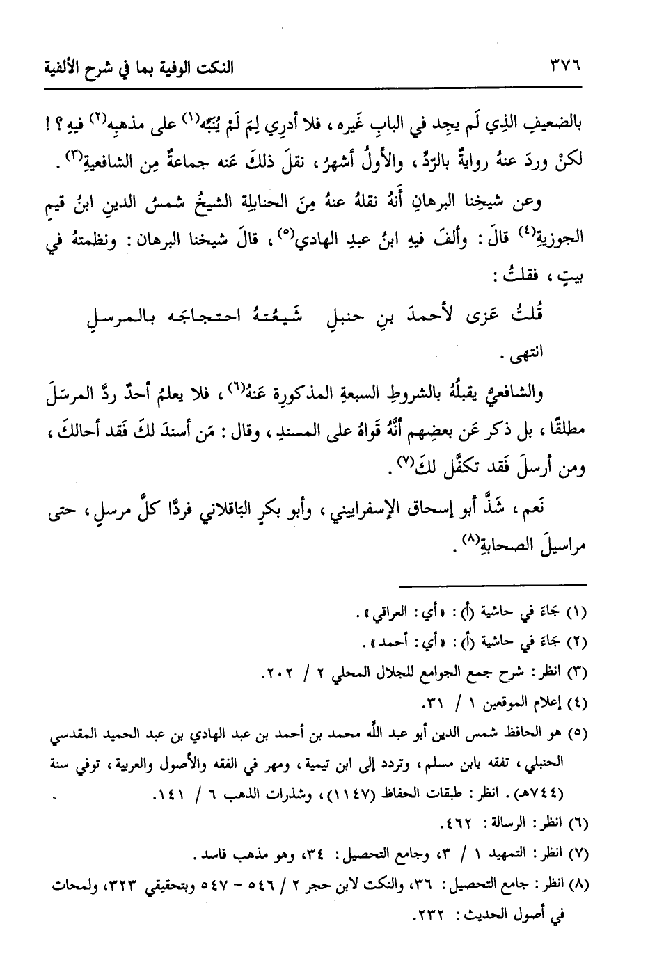وعن شيخنِا البرهانِ أَنهُ نقلهُ عنهُ مِنَ الحنابلةِ الشيخُ شمسُ الدينِ ابنُ قيمِ الجوزيةِ. (¬4) قالَ: وألفَ فيهِ ابنُ عبدِ الهادي (¬5)، قالَ شيخنا البرهان: ونظمتهُ في بيتٍ، فقلتُ: