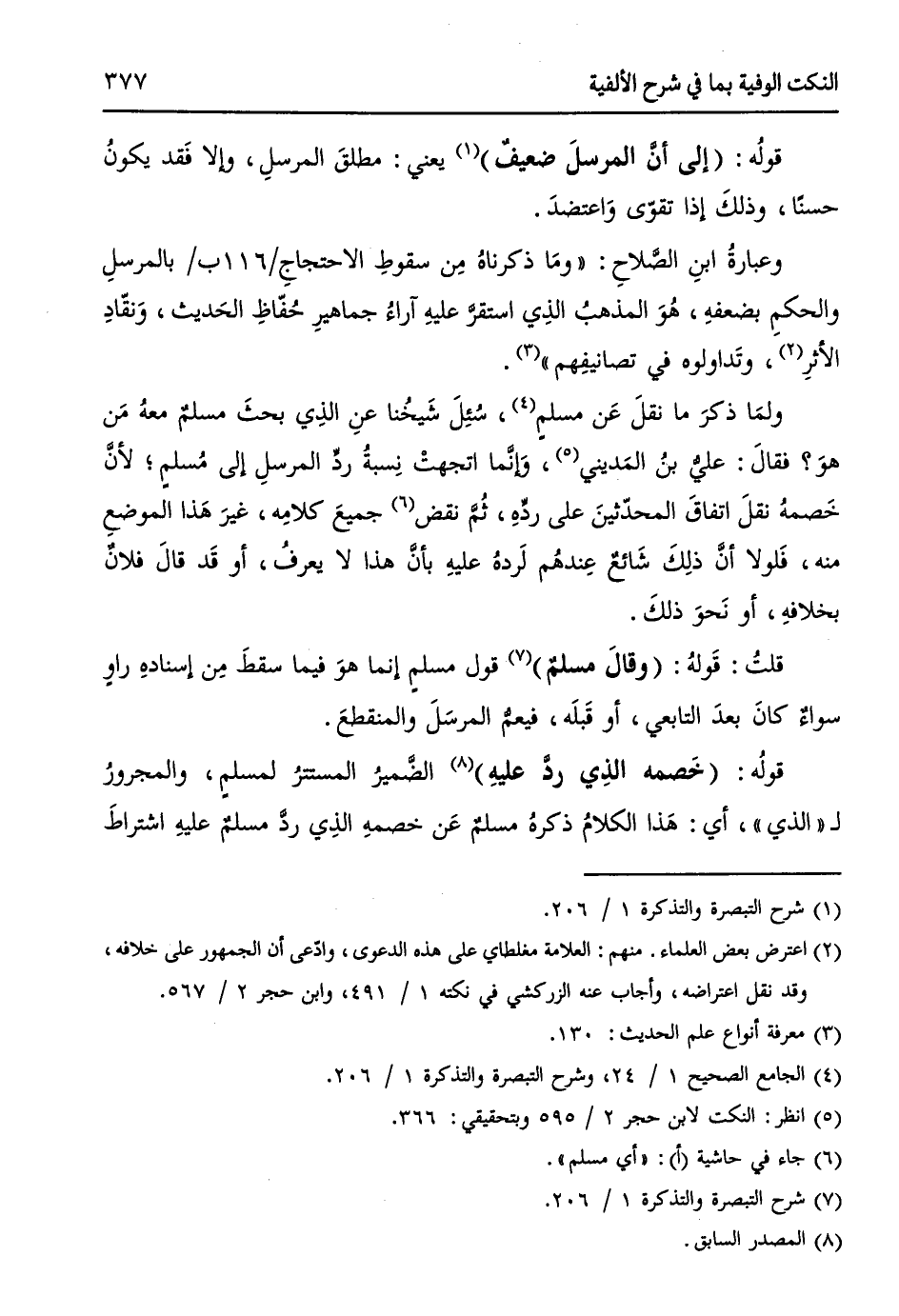 وَلما ذكرَ ما نقلَ عَن مُسلمٍ (¬4)، سُئِلَ شَيخُنا عنِ الذِي بحثَ مسلمٌ معهُ مَن هوَ؟ فقالَ: عليُ بنُ المَدِيني (¬5)، وَإنَّما اتجهتْ نِسبةُ ردِّ المرسلِ إلى مُسلمٍ؛ لأنَّ خَصمهُ نقلَ اتفاقَ المحدّثينَ على ردِّهِ، ثُمَّ نقض (¬6) جميعَ كلامهِ، غيرَ هَذا الموضعِ منهُ، فَلولا أنَّ ذلِكَ شَائعٌ عِندهُم لَردهُ عليهِ بأنَّ هَذا لا يعرفُ، أو قَد قالَ فلانٌ بخلافهِ، أو نَحوَ ذلِكَ.