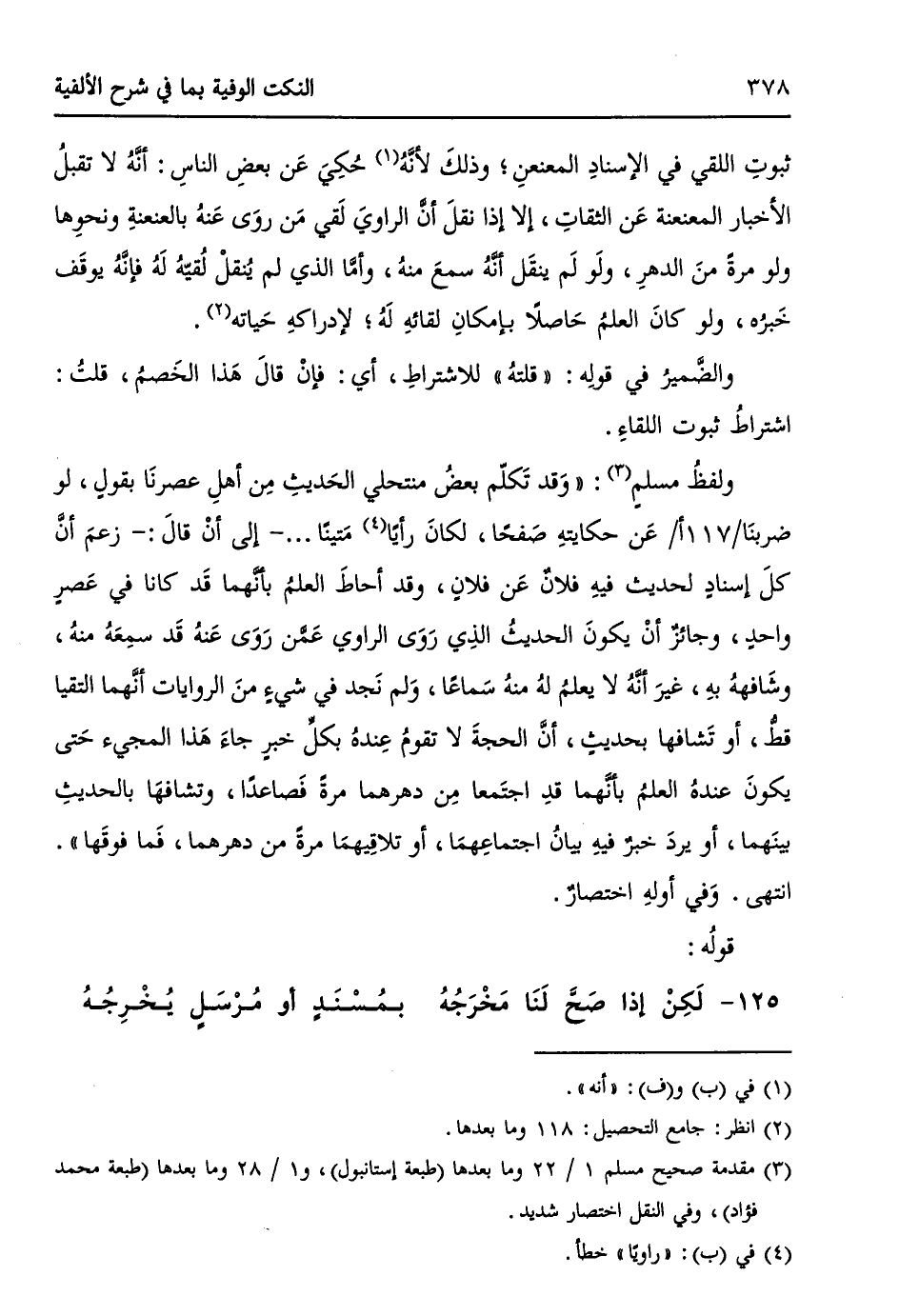 ولفظُ مسلمٍ (¬3): ((وَقد تَكلّمَ بعضُ منتحلي الحَديثِ مِن أهلِ عصرِنَا بقولٍ، لو ضربنَا / 117 أ / عَن حكايتهِ صَفحاً، لكانَ رأياً (¬4) مَتيناً ... - إلى أنْ قالَ: - زعمَ أنَّ كلَ إسنادٍ لحديثِ فيهِ فلانٌ عَن فلانٍ، وقد أحاطَ العلمُ بأنَّهما قَد كانا في عَصرٍ واحدٍ، وجائز أنْ يكونَ الحديثُ الذِي رَوَى الراوي عَمَّن رَوَى عَنهُ قَد سمِعَهُ منهُ، وشَافههُ بهِ، غيرَ أنَّهُ لا يعلمُ لَهُ منهُ سَماعاً، وَلم نَجد في شيءٍ منَ الروايات أنَّهما التقيا قطُّ، أو تَشافها بحديثٍ، أنَّ الحجةَ لا تقومُ عِندهُ بكلِ خبرٍ جاءَ هَذا المجيء حَتى يكونَ عندهُ العلمُ بأنَّهما قدِ اجتَمعا مِن دهرهما مرةً فَصاعداً، وتشافهَا بالحديثِ بينَهما، أو يردَ خبرٌ فيهِ بيانُ اجتماعِهمَا، أو تلاقِيهمَا مرةً من دهرهما، فَما فوقَها)). انتهى. وَفي أولهِ اختصارٌ.