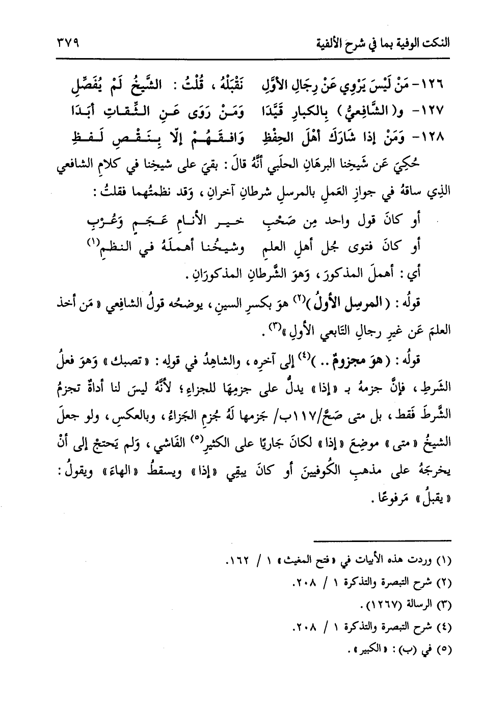 حُكِيَ عَن شَيخِنا البرهَانِ الحلَبي أنَّهُ قالَ: بقيَ على شيخِنا في كلامِ الشافعي الذِي ساقهُ في جوازِ العَملِ بالمرسلِ شرطانِ آخرانِ، وَقد نظمتُهما فقلتُ: