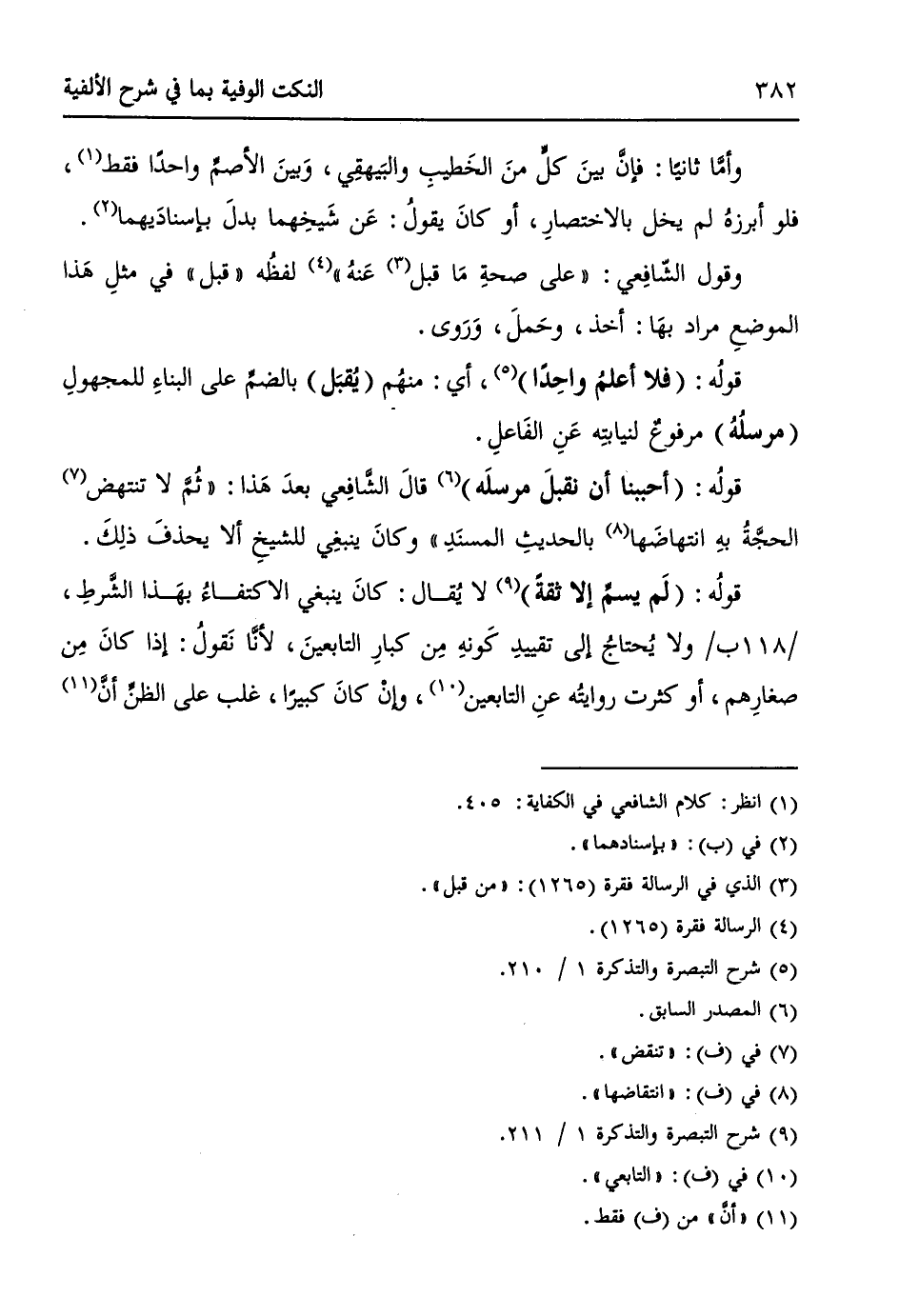 قولُهُ: (لَم يسمِّ إلا ثقةً) (¬9) لا يُقال: كانَ ينبغي الاكتفاءُ بهَذا الشَرطِ، / 118ب / ولا يُحتاجُ إلى تقييدِ كَونهِ مِن كبارِ التابعينَ، لأنَّا نَقولُ: إذا كانَ مِن صغارِهم، أو كثرت روايتهُ عنِ التابعين (¬10)، وإنْ كانَ كبيراً، غلب على الظنِّ أنَّ (¬11)