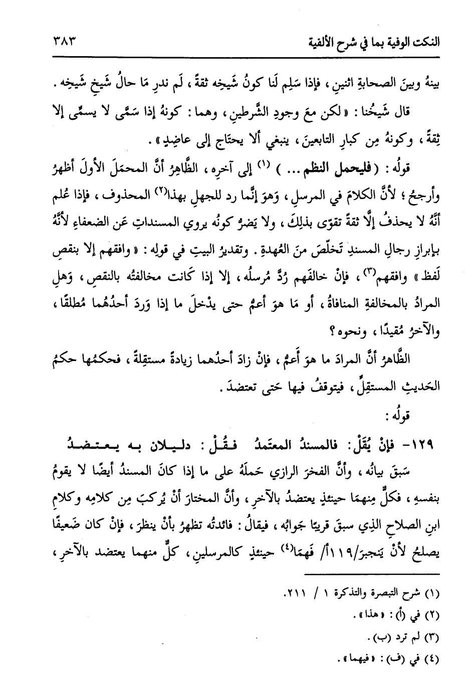 قولُهُ: (فليحمل النظم ... ) (¬1) إلى آخرِه، الظَاهِرُ أنَّ المحمَلَ الأولَ أظهرُ وأرجحُ؛ لأنَّ الكلامَ في المرسلِ، وَهوَ إنَّما رد للجهلِ بهذا (¬2) المحذوف، فإذا عُلم أنَّهُ لا يحذفُ إلاَّ ثقةً تقوّى بذلِكَ، ولا يَضرُّ كونُهُ يروي المسنداتِ عَن الضعفاءِ؛ لأنَّه بإبرازِ رجالِ المسندِ تَخلّصَ منَ العُهدةِ. وتقديرُ البيتِ في قولهِ: ((وافقهم إلا بنقصِ لَفظ)) وافقهم (¬3)، فإنْ خالفَهم رُدَّ مُرسلُه، إلا إذا كَانت مخالفتُه بالنقصِ، وَهلِ المرادُ بالمخالفةِ المنافاةُ، أو مَا هوَ أعمُّ حتى يَدخلَ ما إذا وَردَ أحدُهُما مُطلقاً، والآخرُ مُقيداً، ونحوهُ؟