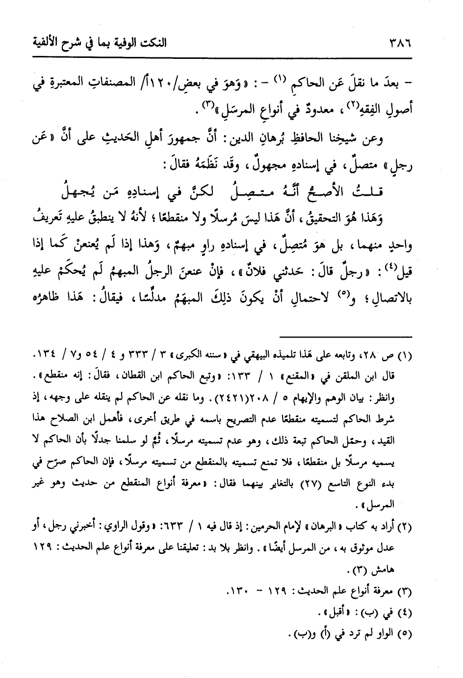 وعن شيخِنا الحافظِ بُرهانِ الدينِ: أنَّ جمهورَ أهلِ الحَديثِ على أنَّ ((عَن رجلٍ)) متصلٌ، في إسنادهِ مجهولٌ، وقَد نَظَمَهُ فقالَ: