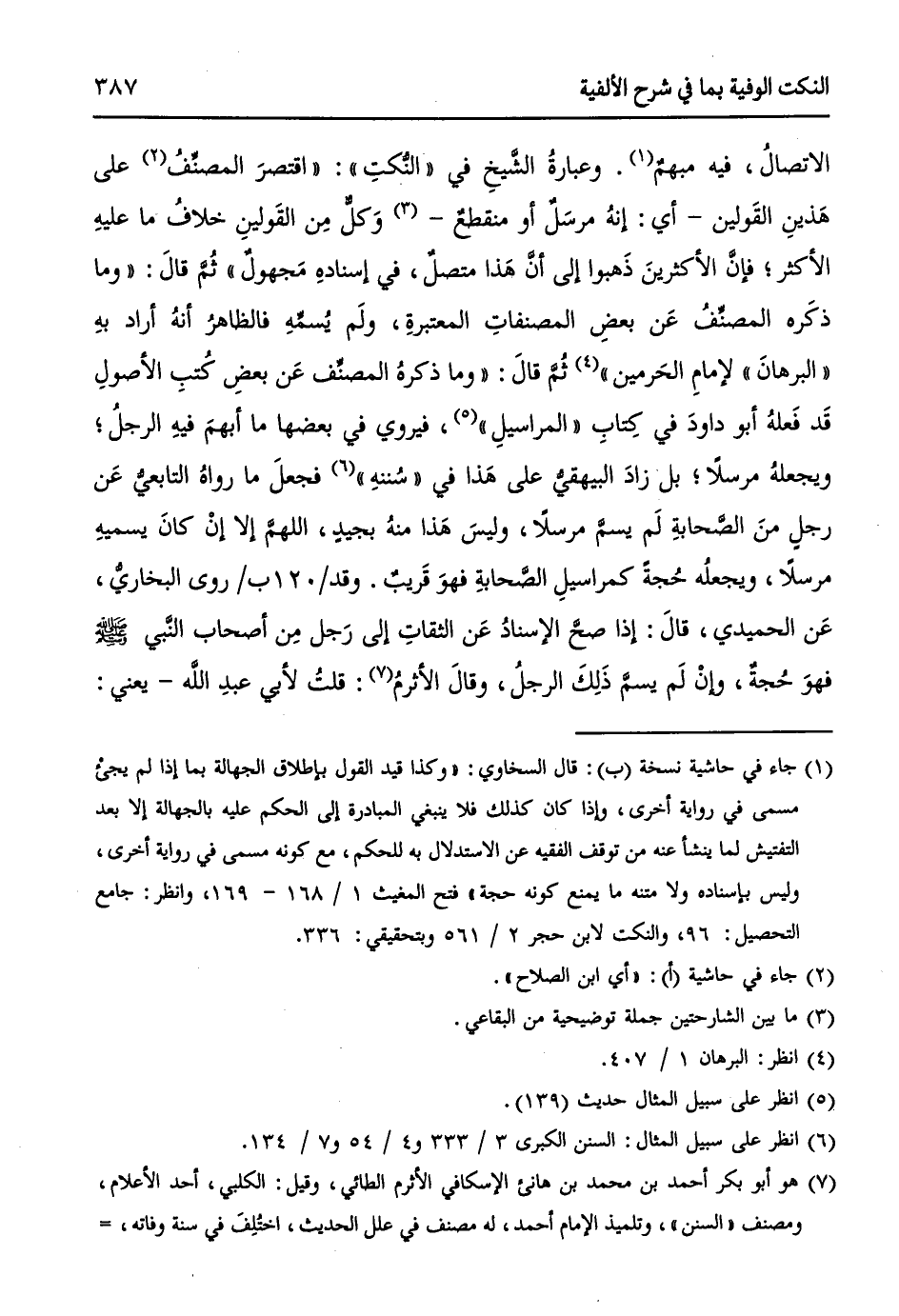 الاتصالُ، فيهِ مبهمٌ (¬1). وعبارةُ الشَيخِ في " النُكتِ ": ((اقتصرَ المصنِّفُ (¬2) على هَذينِ القَولينِ - أي: إنهُ مرسَلٌ أو منقطعٌ - (¬3) وَكلٌّ مِن القَولينِ خلافُ ما عليهِ الأكثر؛ فإنَّ الأكثرينَ ذَهبوا إلى أنَّ هَذا متصلٌ، في إسنادهِ مَجهولٌ)) ثُمَّ قالَ: ((وما ذكرهُ المصنِّفُ عَن بعضِ المصنفاتِ المعتبرةِ، ولَم يُسمِّهِ فالظاهرُ أنهُ أرادَ بهِ "البرهانَ" لإمامِ الحَرمينِ (¬4))) ثُمَّ قالَ: ((وما ذكرهُ المصنِّفُ عَن بعضِ كُتبِ الأصولِ قَد فَعلهُ أبو داودَ في كِتابِ "المراسيلِ" (¬5)، فيروي في بعضها ما أبهمَ فيهِ الرجلُ؛ ويجعلهُ مرسلاً؛ بل زادَ البيهقيُّ على هَذا في "سُننهِ" (¬6) فجعلَ ما رواهُ التابعيُّ عَن رجلٍ منَ الصَحابةِ لَم يسمَّ مرسلاً، وليسَ هَذا منهُ بجيدٍ، اللهمَّ إلا إنْ كانَ يسميهِ مرسلاً، ويجعلُه حُجةً كمراسيلِ الصَحابةِ فهوَ قَريبٌ. وقد /120 ب/ روى البخاريُ، عَن الحميدي، قالَ: إذا صحَّ الإسنادُ عَن الثقاتِ إلى رَجلٍ مِن أصحابِ النَبي - صلى الله عليه وسلم - فهوَ حُجةٌ، وإنْ لَم يسمَّ ذَلِكَ الرجلُ، وقالَ الأثرمُ (¬7): قلتُ لأبي عبدِ اللهِ -يعني: