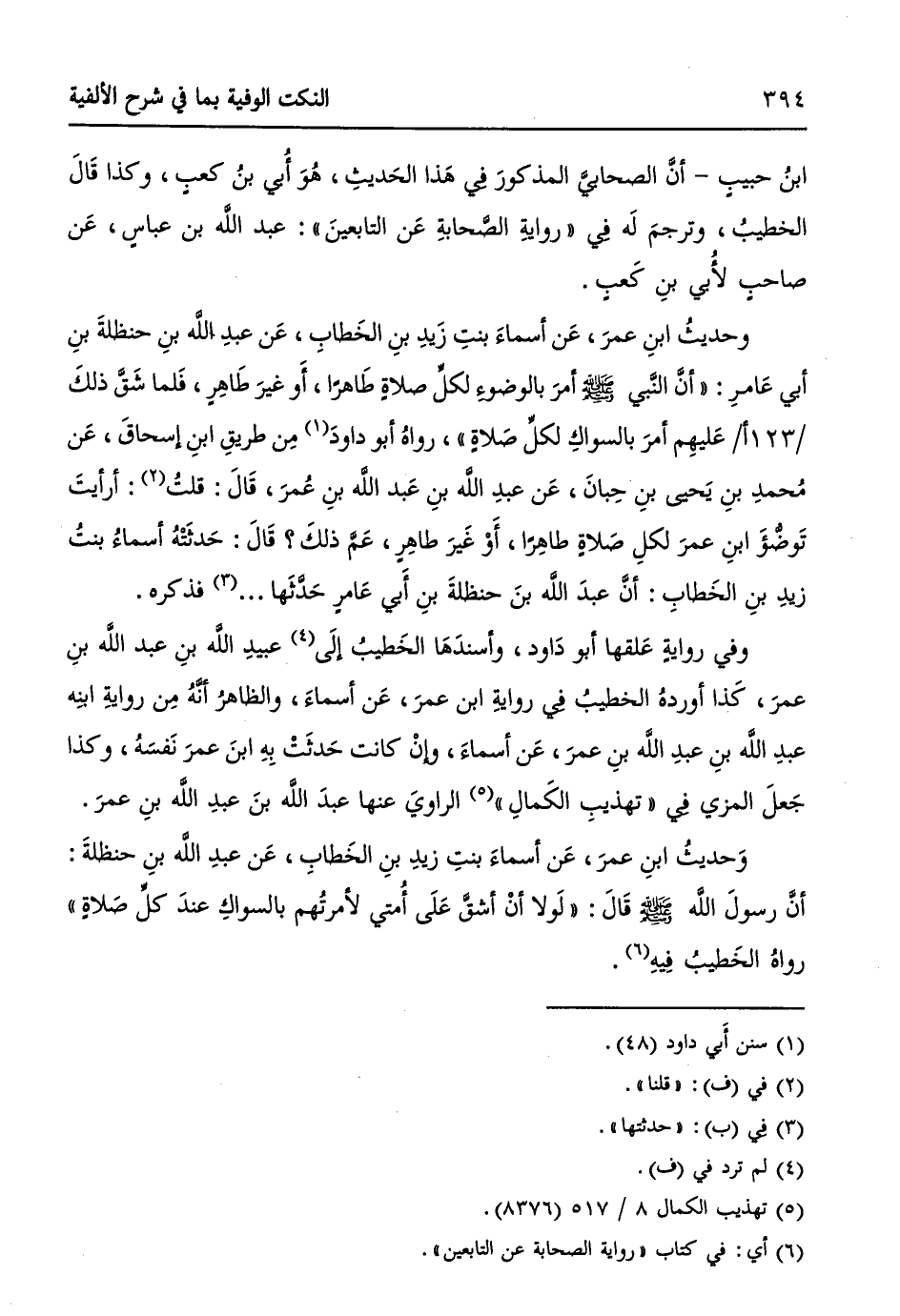 وَحديثُ ابنِ عمرَ، عَن أسماءَ بنتِ زيدِ بنِ الخَطابِ، عَن عبدِ اللهِ بنِ حنظلةَ: أنَّ رسولَ اللهِ - صلى الله عليه وسلم - قَالَ: ((لَولا أنْ أشقَّ عَلَى أُمتي لأمرتُهم بالسِواكِ عندَ كلِّ صَلاةٍ)) رواهُ الخَطيبُ فِيهِ (¬6).