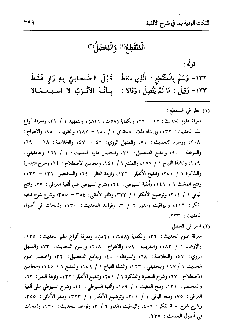132 - وَسَمِّ بِالمُنْقَطِعِ: الَّذِي سَقَطْ ... قَبْلَ الصَّحَابيِّ بِهِ رَاوٍ فَقَطْ