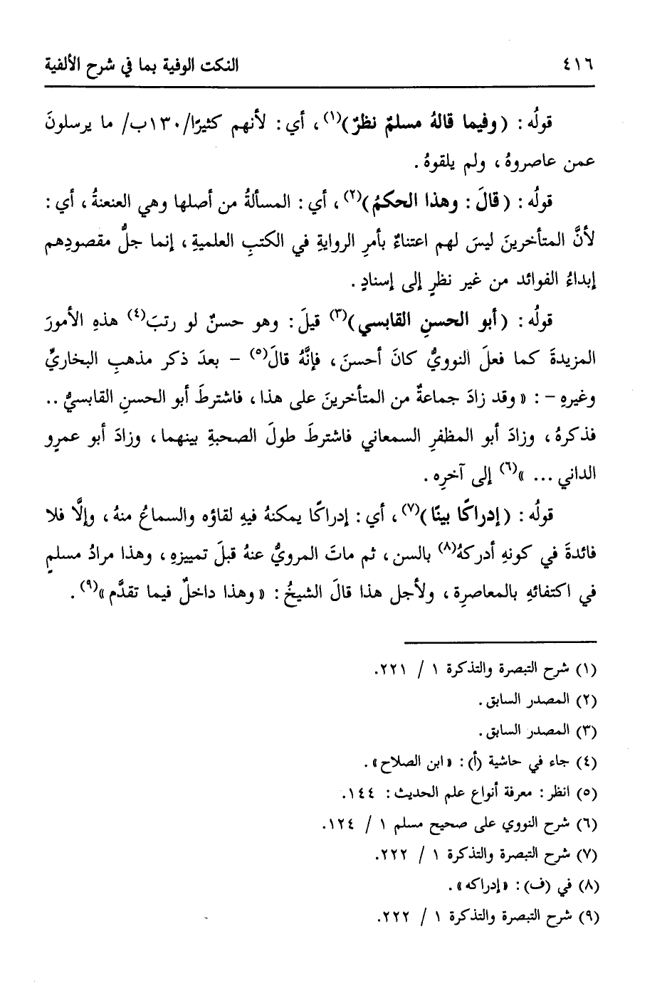 قوله: (إدراكاً بيناً) (¬7)، أي: إدراكاً يمكنهُ فيهِ لقاؤه والسماعُ منهُ، وإلاّ فلا فائدةَ في كونهِ أدركهُ (¬8) بالسن، ثم ماتَ المرويُّ عنهُ قبلَ تمييزهِ، وهذا