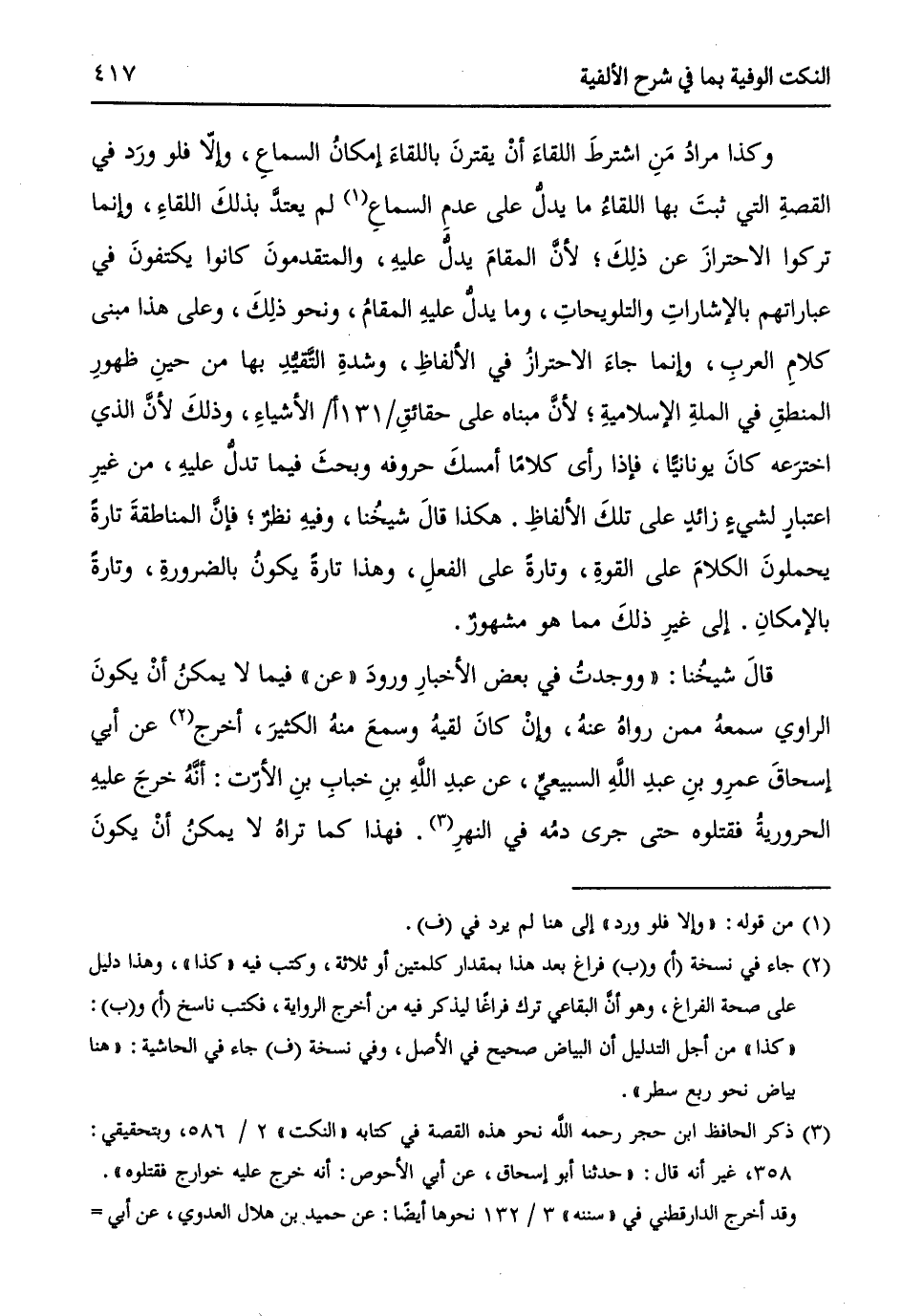 وكذا مرادُ مَنِ اشترطَ اللقاءَ أنْ يقترنَ باللقاءِ إمكانُ السماعِ، وإلاّ فلو وردَ في القصةِ التي ثبتَ بها اللقاءُ ما يدلُ على عدمِ السماعِ (¬1) لم يعتدَّ بذلكَ اللقاءِ، وإنما تركوا الاحترازَ عن ذلِكَ؛ لأنَّ المقامَ يدلُ عليهِ، والمتقدمونَ كانوا يكتفونَ في عباراتهم بالإشاراتِ والتلويحاتِ، وما يدلُّ عليهِ المقامُ، ونحو ذلِكَ، وعلى هذا مبنى كلامِ العربِ، وإنما جاءَ الاحترازُ في الألفاظِ، وشدةِ التَّقيُّدِ بها من حينِ ظهورِ المنطقِ في الملةِ الإسلاميةِ؛ لأنَّ مبناهُ على حقائقِ / 131 أ / الأشياءِ، وذلكَ لأنَّ الذي اخترعهُ كانَ يونانياً، فإذا رأى كلاماً أمسكَ حروفه وبحثَ فيما تدلُّ عليهِ، من غيرِ اعتبارٍ لشيء زائدٍ على تلكَ الألفاظِ. هكذا قالَ شيخُنا، وفيهِ نظرٌ؛ فإنَّ المناطقةَ تارةً يحملونَ الكلامَ على القوةِ، وتارةً على الفعلِ، وهذا تارةً يكونُ بالضرورةِ، وتارةً بالإمكانِ. إلى غيرِ ذلكَ مما هو مشهورٌ.