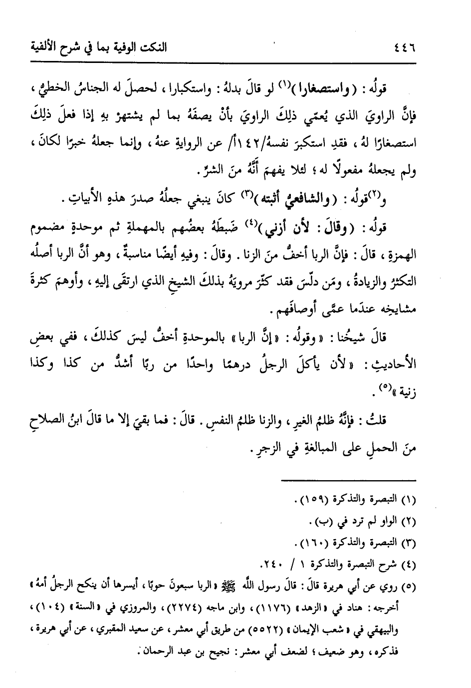 قالَ شيخُنا: ((وقوله: ((إنَّ الربا)) بالموحدةِ أخفُّ ليسَ كذلكَ، ففي بعضِ الأحاديثِ: ((لأن يأكلَ الرجلُ درهماً واحداً من رباً أشدُّ من كذا وكذا زنية)) (¬5))).