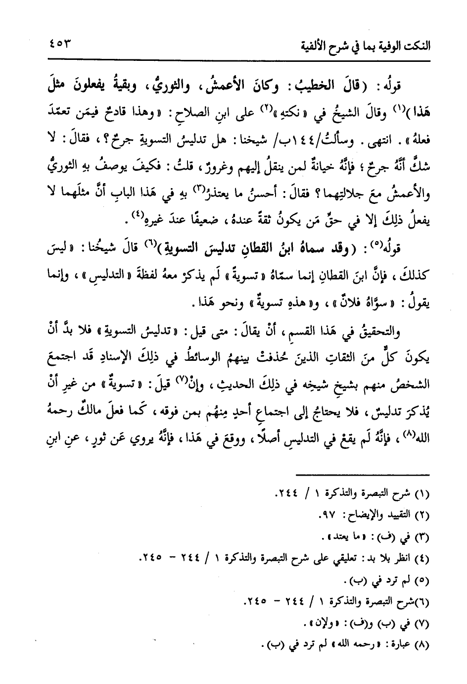 قولُهُ: (قالَ الخطيبُ: وكانَ الأعمشُ، والثوريُّ، وبقيةُ يفعلونَ مثلَ هَذا) (¬1) وقالَ الشيخُ في " نكتهِ " (¬2) على ابنِ الصلاحِ: ((وهذا قادحٌ في مَن تعمّدَ فعلهُ)). انتهى. وسألتُ / 144 ب / شيخنا: هل تدليسُ التسويةِ جرحٌ؟، فقالَ: لا شكَّ أنَّهُ جرحٌ؛ فإنَّهُ خيانةٌ لمن ينقلُ إليهم وغرورٌ، قلتُ: فكيفَ