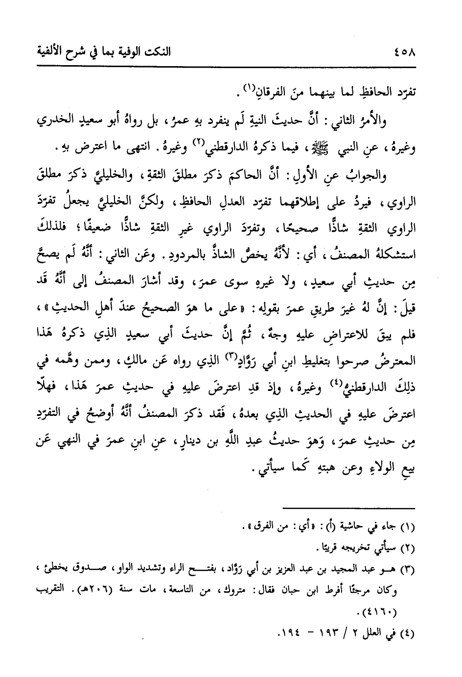 والجوابُ عنِ الأولِ: أنَّ الحاكمَ ذكرَ مطلقَ الثقةِ، والخليليَّ ذكرَ مطلقَ الراوي، فيردُ على إطلاقهما تفرّد العدلِ الحافظِ، ولكنَّ الخليليَّ يجعلُ تفرّدَ الراوي الثقةِ شاذاً صحيحاً، وتفرّدَ الراوي غيرِ الثقةِ شاذاً ضعيفاً؛ فلذلكَ استشكلهُ المصنفُ، أي: لأنَّهُ يخصُّ الشاذَّ بالمردودِ. وعَن الثاني: أنَّهُ لَم يصحَّ مِن حديثِ أبي سعيدٍ، ولا غيرهِ سوى عمرَ، وقد أشارَ المصنفُ إلى أنَّهُ قَد قيلَ: إنَّ لهُ غيرَ طريقِ عمرَ بقولهِ: ((على ما هوَ الصحيحُ عندَ أهلِ الحديثِ))، فلم يبقَ للاعتراضِ عليهِ وجهٌ، ثُمَّ إنَّ حديثَ أبي سعيدٍ الذِي ذكرهُ هَذا المعترضُ صرحوا بتغليطِ ابنِ أبي رَوَّادٍ (¬3) الذِي رواهُ عَن مالكٍ، وممن وهَّمهُ في ذلِكَ الدارقطنيُّ (¬4) وغيرهُ، وإذ قدِ اعترضَ عليهِ في حديثِ عمرَ هَذا، فهلاّ اعترضَ عليهِ في الحديثِ الذِي بعدهُ، فَقد ذكرَ المصنفُ أنَّهُ أوضحُ في التفرّدِ مِن حديثِ عمرَ، وَهوَ حديثُ عبدِ اللهِ بنِ دينارٍ، عنِ ابنِ عمرَ في النهي عَن بيعِ الولاءِ وعن هبتهِ كَما سيأتي.