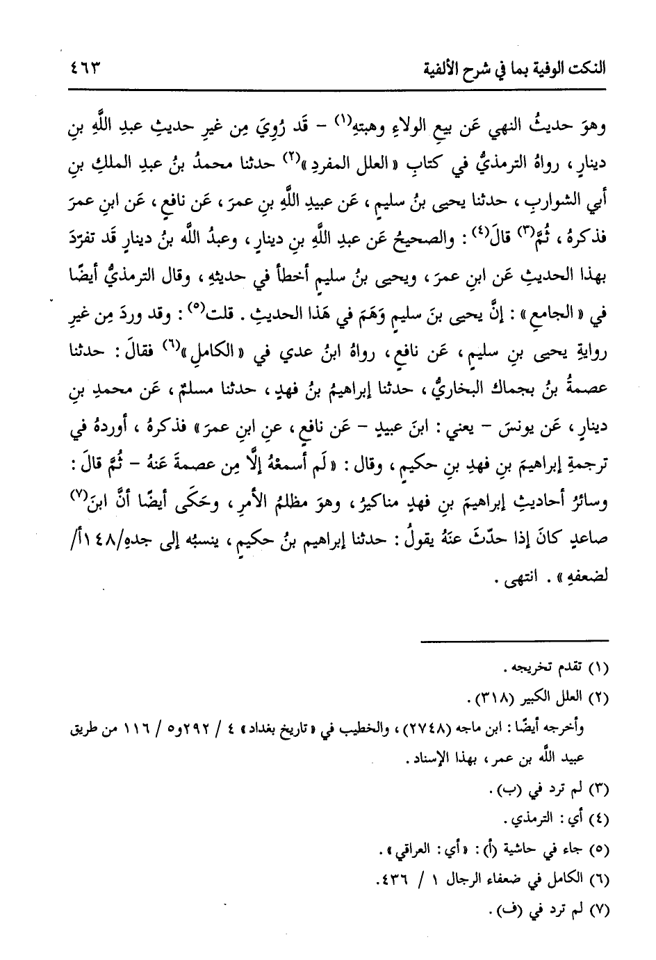 وهوَ حديثُ النهي عَن بيعِ الولاءِ وهبتهِ (¬1) - قَد رُوِيَ مِن غيرِ حديثِ عبدِ اللهِ بنِ دينارٍ، رواهُ الترمذيُّ في كتابِ " العلل المفردِ " (¬2) حدثنا محمدُ بنُ عبدِ الملكِ بنِ أبي الشواربِ، حدثنا يحيى بنُ سليمٍ، عَن عبيدِ اللهِ بنِ عمرَ، عَن نافعٍ، عَن ابنِ عمرَ فذكرهُ، ثُمَّ (¬3) قالَ (¬4): والصحيحُ عَن عبدِ اللهِ بنِ دينارٍ، وعبدُ الله بنُ دينارٍ قَد تفرّدَ بهذا الحديثِ عَن ابنِ عمرَ، ويحيى بنُ سليمٍ أخطأ في حديثهِ، وقال الترمذيُّ أيضاً في " الجامعِ ": إنَّ يحيى بنَ سليمٍ وَهِمَ في هَذا الحديثِ. قلت (¬5): وقد وردَ مِن غيرِ روايةِ يحيى بنِ سليمٍ، عَن نافعٍ، رواهُ ابنُ عدي في "الكاملِ" (¬6) فقالَ: حدثنا عصمةُ بنُ بجماك البخاريُّ، حدثنا إبراهيمُ بنُ فهدٍ، حدثنا مسلمٌ، عَن محمدِ ابنِ دينارٍ، عَن يونسَ -يعني: ابنَ عبيدٍ-، عَن نافعٍ، عنِ ابنِ عمرَ)) فذكرهُ، أوردهُ في ترجمةِ إبراهيمَ بنِ فهدِ بنِ حكيمٍ، وقال: ((لَم أسمعْهُ إلاَّ مِن عصمةَ عَنهُ - ثُمَّ قالَ: وسائرُ أحاديثِ إبراهيمَ بنِ فهدٍ مناكيرُ، وهوَ مظلمُ الأمرِ، وحَكَى أيضاً أنَّ ابنَ (¬7) صاعدٍ، كانَ إذا حدّثَ عَنهُ يقولُ: حدثنا إبراهيم بنُ حكيمٍ، ينسبهُ إلى جدهِ / 148 أ / لضعفهِ)). انتهى.
