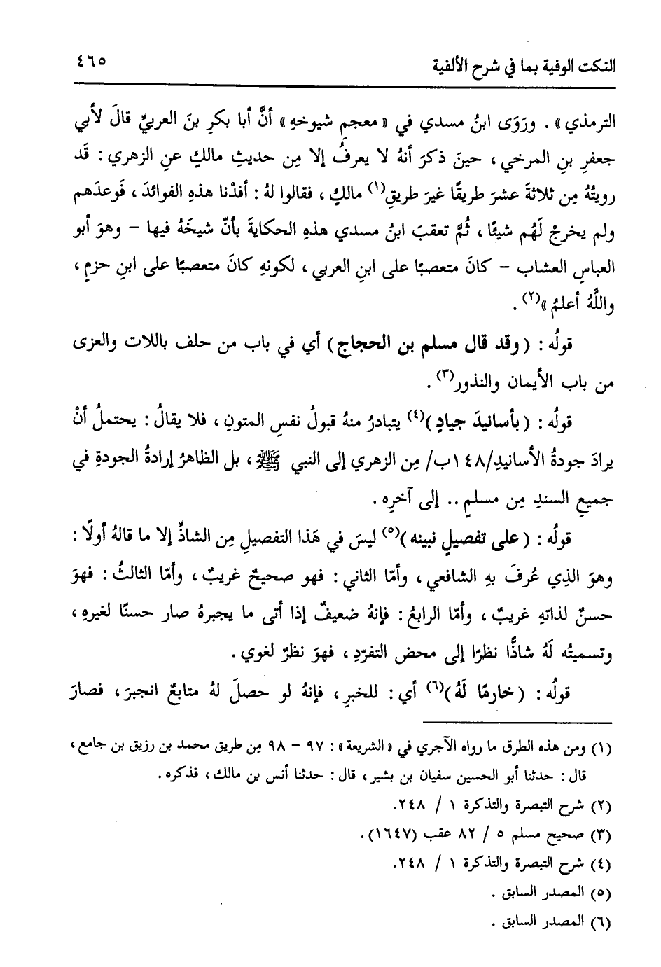 قولُهُ: (على تفصيلٍ نبينه) (¬5) ليسَ في هَذا التفصيلِ مِن الشاذِّ إلا ما قالهُ أولاً، وهوَ الذِي عُرفَ بهِ الشافعي، وأمّا الثاني: فهو صحيحٌ غريبٌ، وأمّا الثالثُ: فهوَ حسنٌ لذاتهِ غريبٌ، وأمّا الرابعُ: فإنهُ ضعيفٌ إذا أتى ما يجبرهُ صار حسناً لغيرهِ، وتسميتهُ لَهُ شاذاً نظراً إلى محض التفرّدِ، فهوَ نظرٌ لغوي.