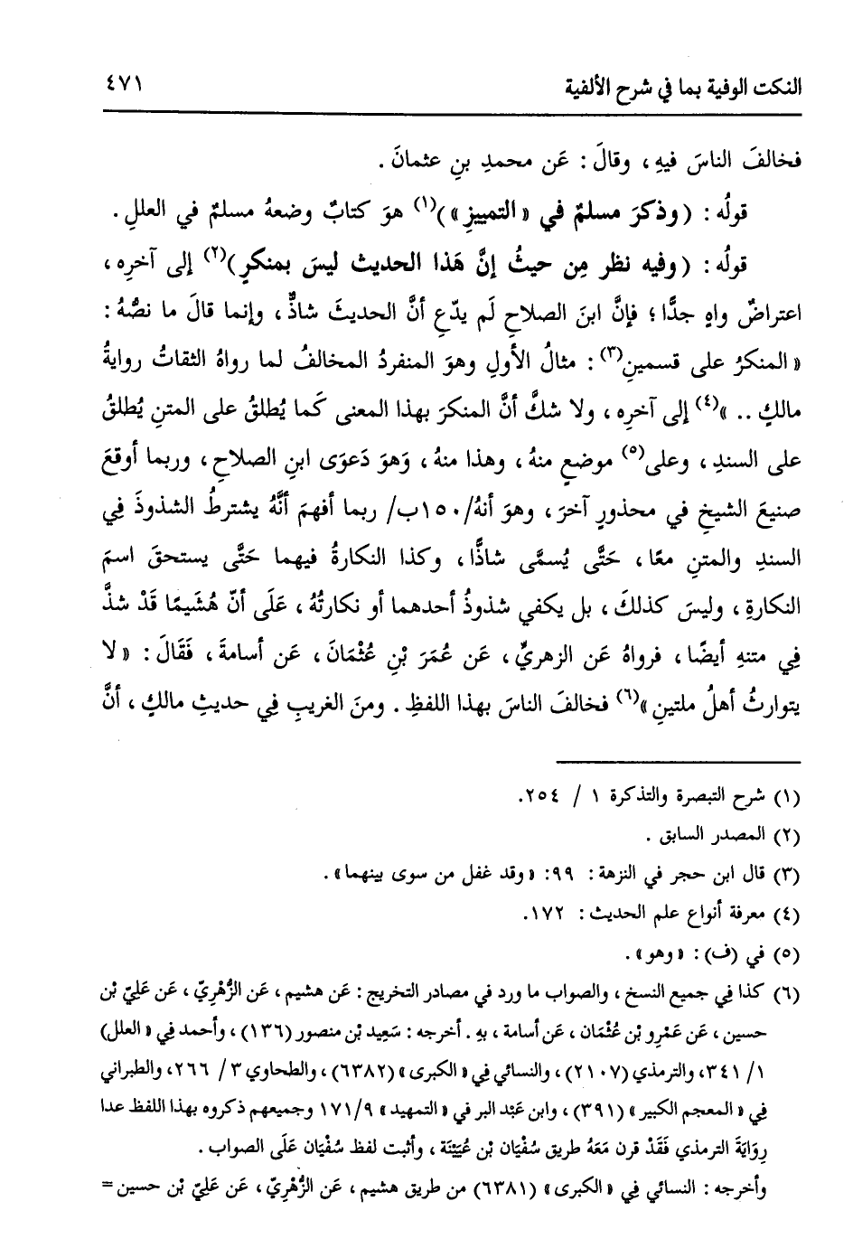 ((المنكرُ على قسمينِ (¬3): مثالُ الأولِ - وهوَ المنفردُ المخالفُ لما رواهُ الثقاتُ - روايةُ مالكٍ .. )) (¬4) إلى آخرهِ، ولا شكَّ أنَّ المنكرَ بهذا المعنى كَما يُطلقُ على المتنِ يُطلقُ على السندِ، وعلى (¬5) موضعٍ منهُ، وهذا منهُ، وَهوَ دَعوَى ابنِ الصلاحِ، وربما أوقعَ صنيعَ الشيخِ في محذورٍ آخرَ، وهوَ أنهُ / 150 ب / ربما أفهمَ أَنَّهُ يشترطُ الشذوذَ فِي السندِ والمتنِ معاً، حَتَّى يُسمَّى شاذاً، وكذا النكارةُ فيهما حَتَّى يستحقَ اسمَ النكارةِ، وليسَ كذلكَ، بل يكفي شذوذُ أحدهما أو نكارتُهُ، عَلَى أنّ هُشَيماً قَدْ شذَّ فِي متنهِ أيضاً، فرواهُ عَن الزهريِّ، عَن عُمَرَ بْنِ عُثْمَانَ، عَن أسامةَ، فَقَالَ: ((لا يتوارثُ أهلُ ملتينِ)) (¬6) فخالفَ الناسَ بهذا اللفظِ. ومنَ الغريبِ فِي حديثِ مالكٍ، أنَّ