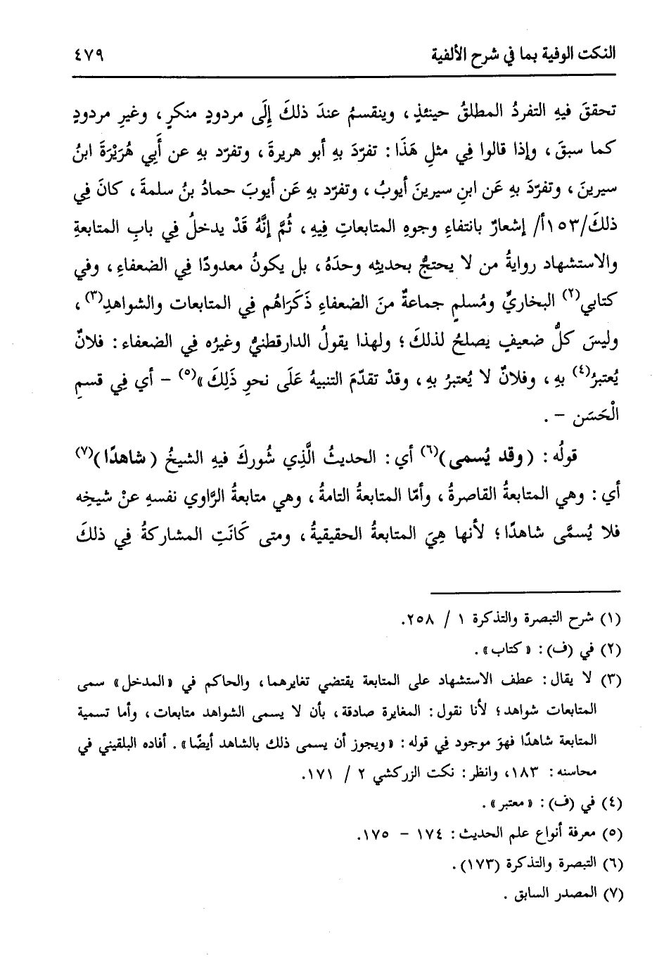 (¬2) لا يقال: عطف الاستشهاد على المتابعة يقتضي تغايرهما، والحاكم في " المدخل " سمى المتابعات شواهد؛ لأنا نقول: المغايرة صادقة، بأن لا يسمى الشواهد متابعات، وأما تسمية المتابعة شاهداً فهوَ موجود فِي قوله: ((ويجوز أن يسمى ذلك بالشاهد أيضاً)). أفاده البلقيني في محاسنه: 183، وانظر: نكت الزركشي 2/ 171.
