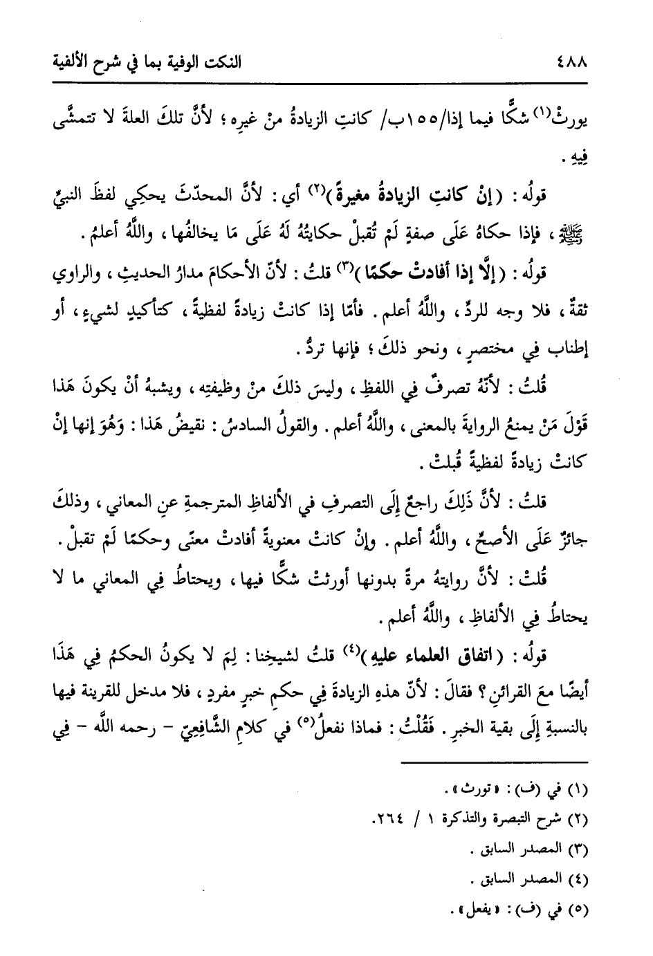 قولُهُ: (إلاَّ إذا أفادتْ حكماً) (¬3) قلتُ: لأنّ الأحكامَ مدارُ الحديثِ، والراوي ثقةٌ، فلا وجه للردِّ، واللهُ أعلم. فأمّا إذا كانتْ زيادةً لفظيةً، كتأكيدٍ لشيءٍ، أو إطنابٍ فِي مختصرٍ، ونحو ذلكَ؛ فإنها تردُّ.