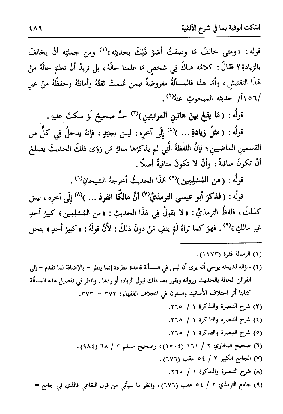 قوله: ((ومتى خالفَ مَا وصفتُ أضرَّ ذَلِكَ بحديثهِ)) (¬1) ومن جملتهِ أنْ يخالفَ بالزيادةِ؟ فقالَ: كلامهُ هناكَ فِي شخصٍ مَا علمنا حالَهُ، بل نريدُ أنْ نعلمَ حالَهُ منْ هَذَا التفتيشِ، وأمّا هنا فالمسألةُ مفروضةٌ فيمن عُلمتْ ثقتُهُ وأمانتُهُ وحفظُهُ منْ غيرِ / 156 أ / حديثهِ المبحوثِ عنهُ (¬2).
