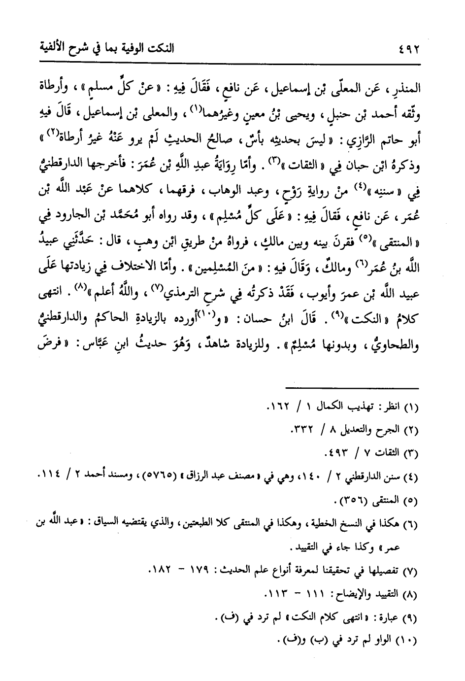 المنذرِ، عَن المعلى بن إسماعيل، عَن نافعٍ، فَقَالَ فِيهِ: ((عنْ كلِّ مسلمٍ))، وأرطاة وثّقه أحمد بن حنبلٍ، ويحيى بنُ معينٍ وغيرُهما (¬1)، والمعلى بن إسماعيل، قَالَ فيهِ أبو حاتم الرَّازِي: ((ليسَ بحديثهِ بأسٌ، صالحُ الحديثِ لَمْ يرو عَنْهُ غيرُ أرطاة (¬2))) وذكرهُ ابن حبان فِي " الثقات " (¬3). وأمّا رِوَايَةُ عبدِ اللهِ بن عُمَرَ: فأخرجها الدارقطنيُّ فِي " سننهِ " (¬4) منْ روايةِ رَوْحٍ، وعبد الوهاب، فرقهما، كلاهما عنْ عَبْد الله بن عُمَر، عَن نافعٍ، فَقَالَ فِيهِ: ((عَلَى كلِّ مُسْلِم))، وقد رواه أبو مُحَمَّد ابن الجارود فِي " المنتقى" (¬5) فقرنَ بينه وبين مالكٍ، فرواهُ منْ طريقِ ابن وهبٍ، قال: حَدَّثَنِي عبيدُ اللهِ بنُ عُمَر (¬6) ومالكٌ، وَقَالَ فيهِ: ((منَ المُسْلِمِين)). وأمّا الاختلاف فِي زيادتها عَلَى عبيد الله بن عمرَ وأيوب، فَقَدْ ذكرتهُ فِي شرحِ الترمذي (¬7)، واللهُ أعلم (¬8))). انتهى كلامُ " النكت " (¬9). قَالَ ابنُ حسان: ((و (¬10) أورده بالزيادةِ الحاكمُ والدارقطنيُّ والطحاويُّ، وبدونها مُسْلِمٌ)). وللزيادة شاهدٌ، وَهُوَ حديثُ ابْن عَبَّاس: ((فرضَ