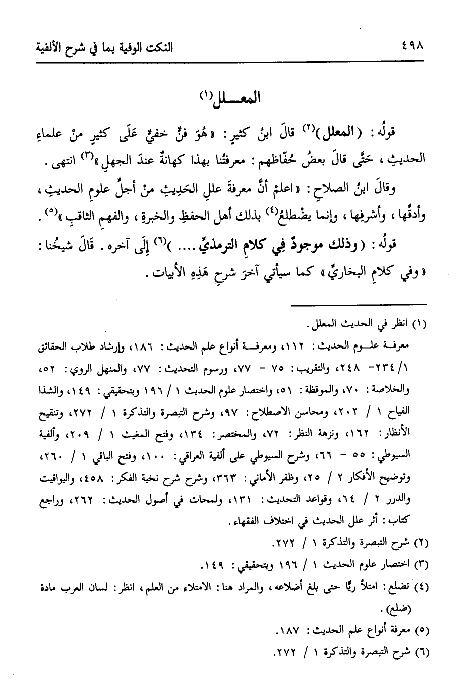 قولُهُ: (المعلل) (¬2) قالَ ابنُ كثيرٍ: ((هُوَ فنٌ خفيٌّ عَلَى كثيرٍ منْ علماءِ الحديثِ، حَتَّى قالَ بعضُ حُفّاظهم: معرفتُنا بهذا كهانةٌ عندَ الجاهلِ)) (¬3) انتهى.