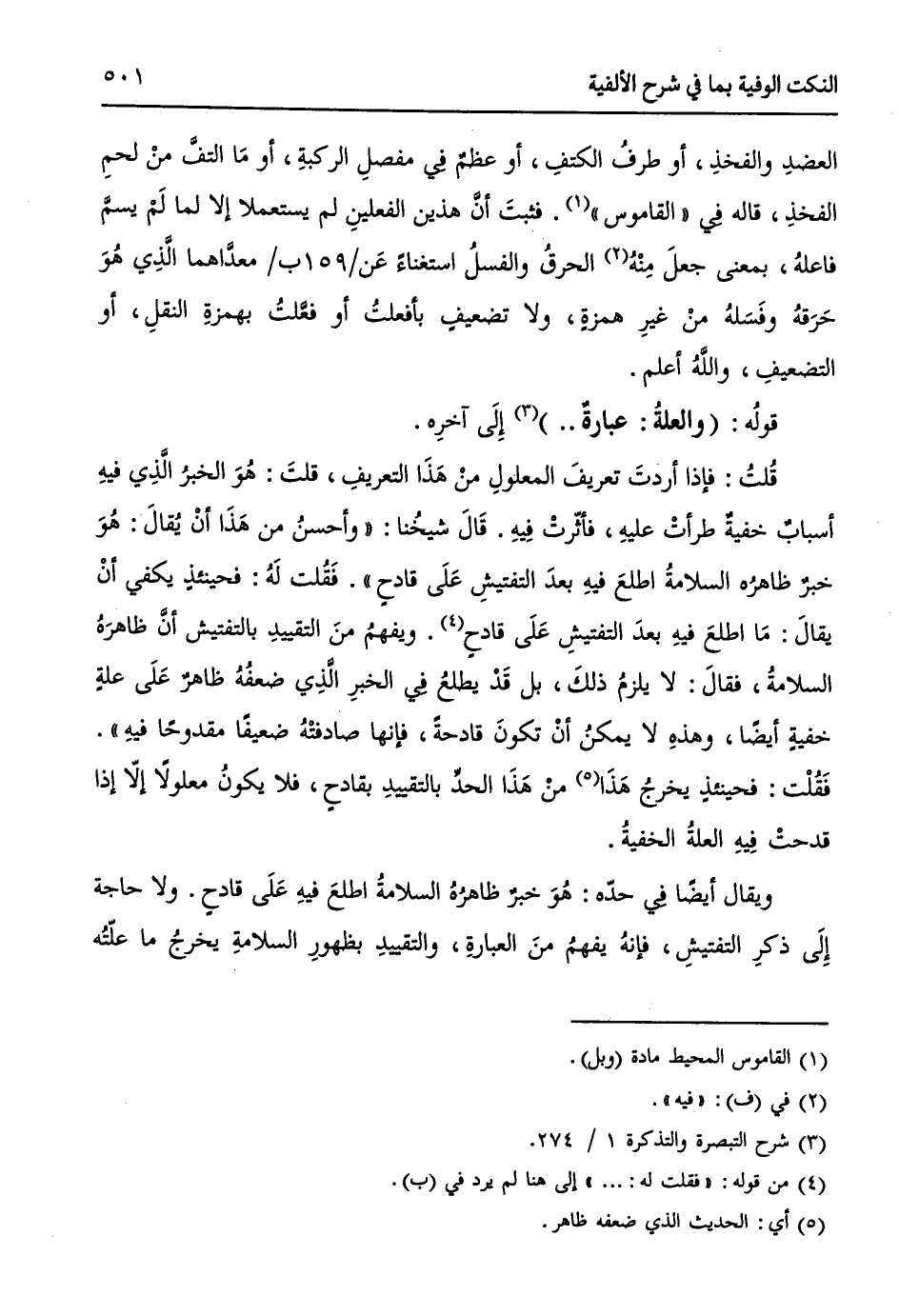 قُلتُ: فإذا أردتَ تعريفَ المعلولِ منْ هَذَا التعريفِ، قلتَ: هُوَ الخبرُ الَّذِي فيهِ أسبابٌ خفيةٌ طرأتْ عليهِ، فأثّرتْ فِيهِ. قَالَ شيخُنا: ((وأحسنُ من هَذَا أنْ يقالَ: هُوَ خبرٌ ظاهرهُ السلامةُ اطلعَ فيهِ بعدَ التفتيشِ عَلَى قادحِ)). فَقُلت لَهُ: فحينئذٍ يكفي أنْ يقالَ: مَا اطلعَ فيهِ بعدَ التفتيشِ عَلَى قادحٍ (¬4). ويفهمُ منَ التقييدِ بالتفتيش أنَّ ظاهرَهُ السلامةُ، فقالَ: ((لا يلزمُ ذلكَ، بل قَدْ يطلعُ فِي الخبرِ الَّذِي ضعفُهُ ظاهرٌ عَلَى علةٍ خفيةٍ أيضاً، وهذهِ لا يمكنُ أنْ تكونَ قادحةً، فإنها صادفتْهُ ضعيفاً مقدوحاً فيهِ)). فَقُلْت: فحينئذٍ يخرجُ هَذَا (¬5) منْ هَذَا الحدِّ بالتقييدِ بقادحٍ، فلا يكونُ معلولاً إلاّ إذا قدحتْ فِيهِ العلةُ الخفيةُ.