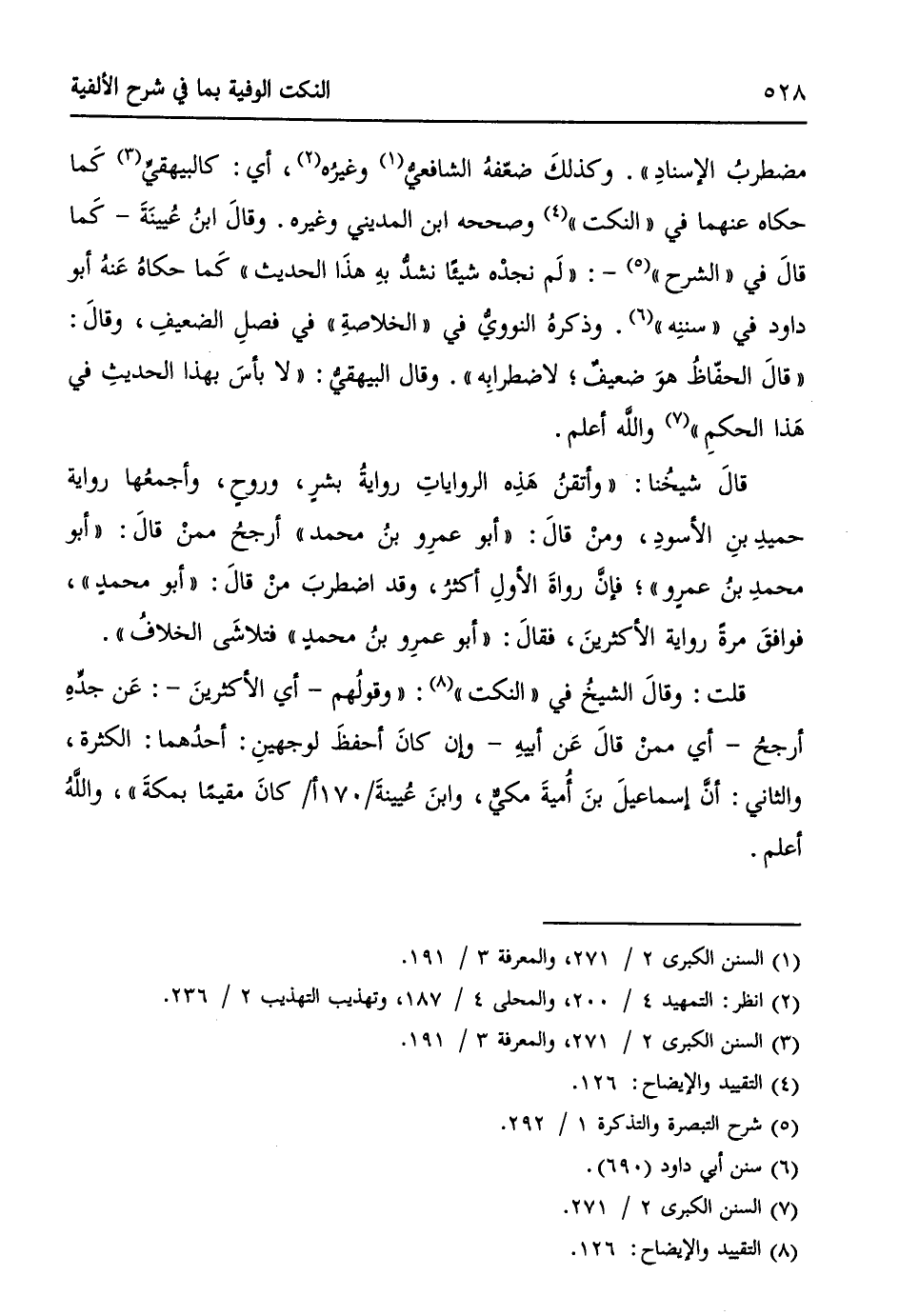 مضطربُ الإسنادِ)). وكذلكَ ضعّفهُ الشافعيُّ (¬1) وغيرُه (¬2)، أي: كالبيهقيِّ (¬3) كَما حكاه عنهما في " النكت " (¬4) وصححه ابن المديني وغيره. وقالَ ابنُ عُيينَةَ - كَما قالَ في " الشرح " (¬5) -: ((لَم نجدْ شيئاً نشدُّ بهِ هَذا الحديثَ)) كَما حكاهُ عَنهُ أبو داود في " سننهِ " (¬6). وذكرهُ النوويُّ في " الخلاصةِ " في فصلِ الضعيفِ، وقالَ: ((قالَ الحفّاظُ هوَ ضعيفٌ؛ لاضطرابهِ)). وقال البيهقيُّ: ((لا بأسَ بهذا الحديثِ في هَذا الحكمِ)) (¬7) واللهُ أعلم.