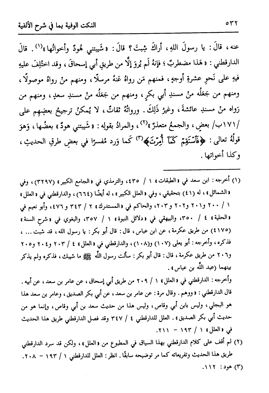 عنه، قالَ: يا رسولَ اللهِ، أراكَ شِبتَ؟ قالَ: ((شَيبتني هُوُدٌ وأخواتُها (¬1))). قالَ الدارقطني: ((هَذا مضطربٌ؛ فإنهُ لَم يُروَ إلاَّ من طريقِ أبي إسحاقَ، وقد اختُلِفَ عليهِ فيهِ على نَحوِ عشرةِ أوجهٍ، فمنهم مَن رواهُ عَنهُ مرسلاً، ومنهم منْ رواهُ موصولاً، ومنهم من جَعَلهُ منْ مسندِ أبي بكرٍ، ومنهم من جَعَلهُ منْ مسندِ سعدٍ، ومنهم من رَواه منْ مسندِ عائشةَ، وغيرُ ذَلِكَ. ورواتُهُ ثقاتٌ، لا يُمكنُ ترجيحُ بعضِهِم على / 171ب / بعضٍ، والجمعُ متعذرٌ)) (¬2)، والمرادُ بقولهِ: ((شَيَّبتني هودٌ)) بعضُها، وَهوَ قولُهُ تعالى: {فَاسْتَقِمْ كَمَا أُمِرْتَ} (¬3) كَما وَرد مُفسراً في بعضِ طرقِ الحديثِ، وكذا أخواتها.