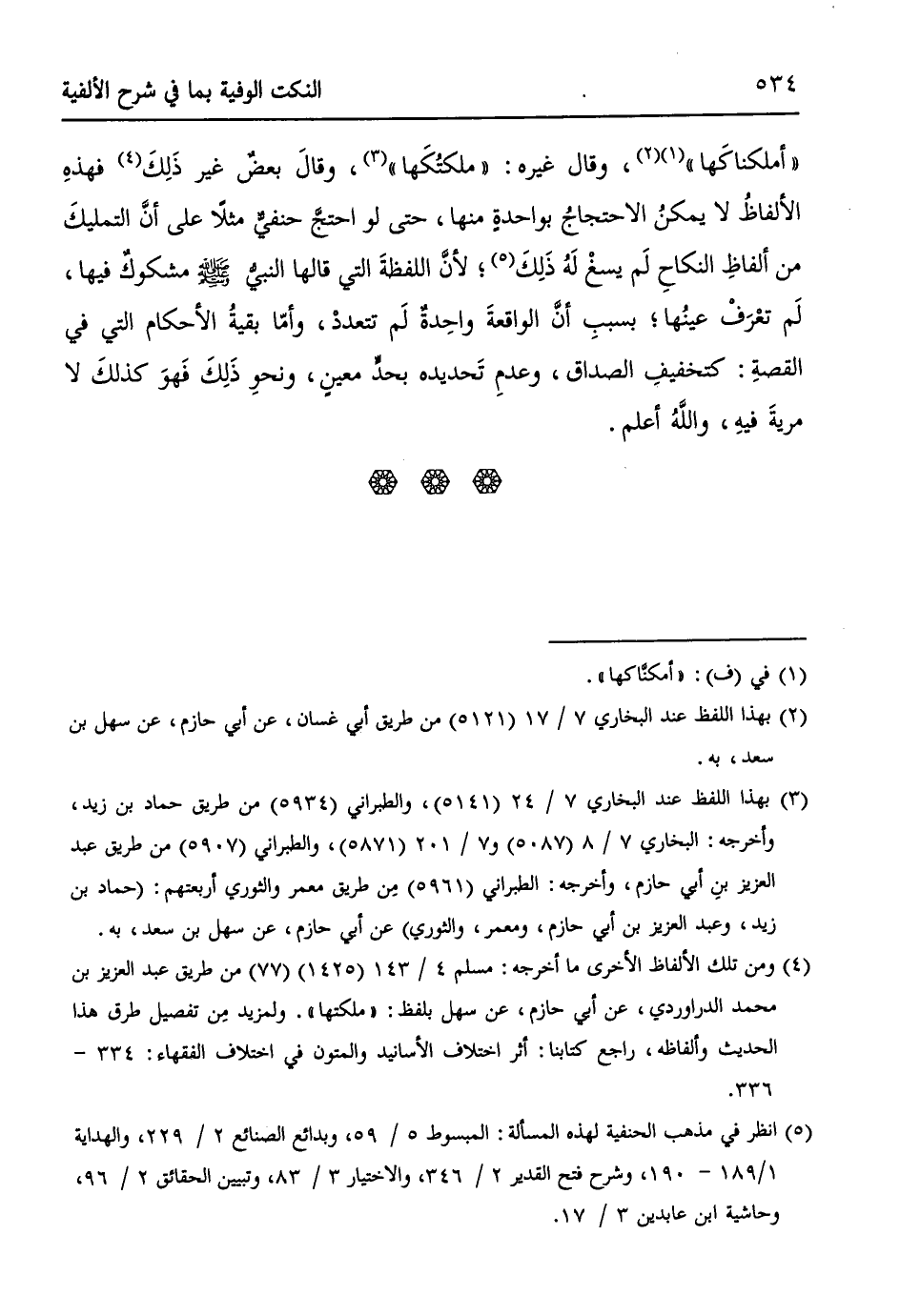 (¬4) ومن تلك الألفاظ الأخرى ما أخرجه: مسلم 4/ 143 (1425) (77) من طريق عبد العزيز بن محمد الدراوردي، عن أبي حازم، عن سهل بلفظ: ((ملكتها)). ولمزيد مِن تفصيل طرق هذا الحديث وألفاظه، راجع كتابنا: أثر اختلاف الأسانيد والمتون في اختلاف الفقهاء: 334 - 336.