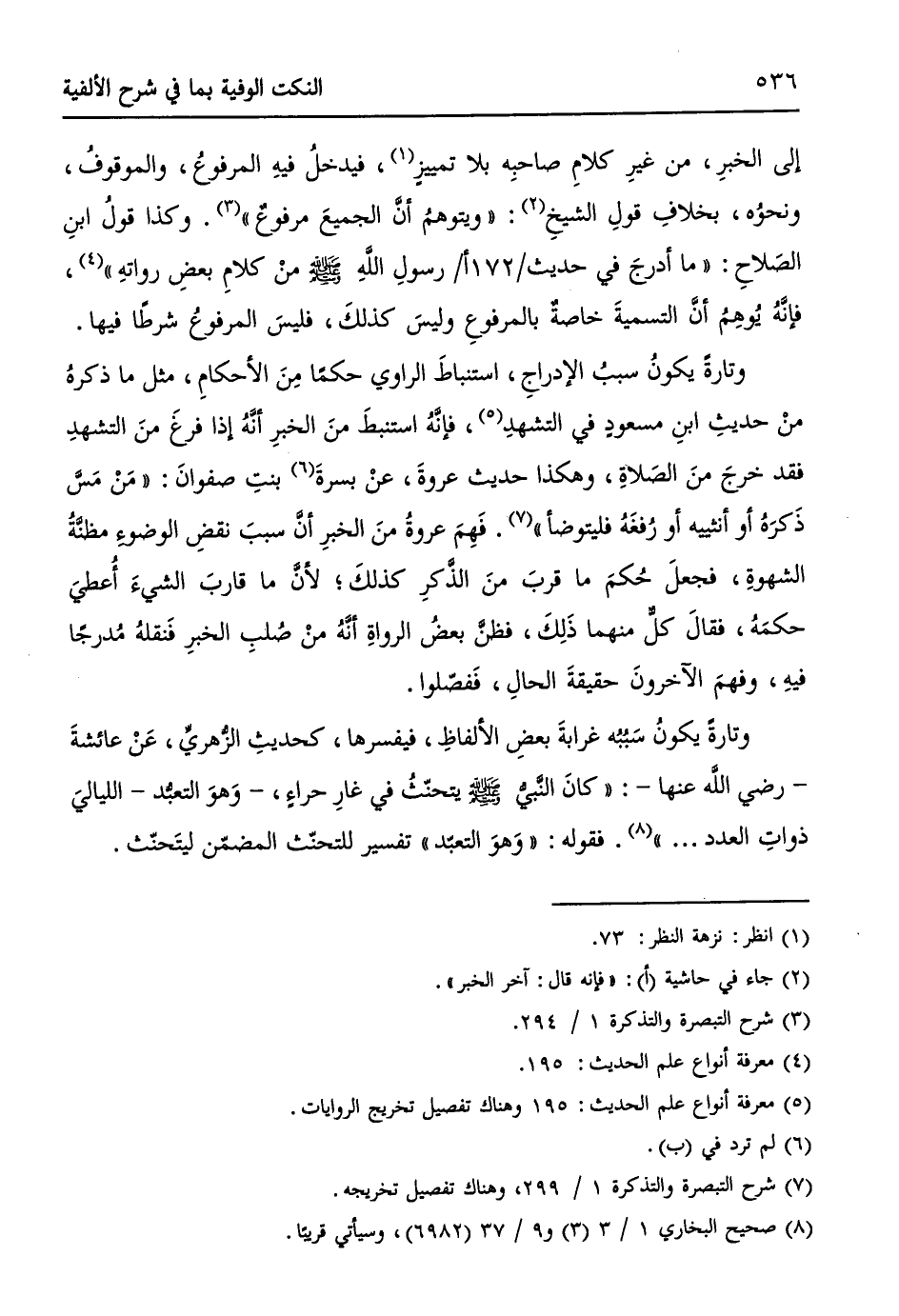 إلى الخبرِ، من غيرِ كلامِ صاحبهِ بلا تمييزٍ (¬1)، فيدخلُ فيهِ المرفوعُ، والموقوفُ، ونحوهُ، بخلافِ قولِ الشيخِ (¬2): ((ويتوهمُ أنَّ الجميعَ مرفوعٌ (¬3))). وكذا قولُ ابنِ الصَلاحِ: ((ما أدرجَ في حديث /172 أ/ رسولِ اللهِ - صلى الله عليه وسلم - منْ كلامِ بعضِ رواتهِ)) (¬4)، فإنَّهُ يُوهِمُ أنَّ التسميةَ خاصةٌ بالمرفوعِ وليسَ كذلكَ، فليسَ المرفوعُ شرطاً فيها. وتارةً يكونُ سببُ الإدراجِ، استنباطَ الراوي حكماً مِنَ الأحكامِ، مثل ما ذكرهُ منْ حديثِ ابنِ مسعودٍ في التشهدِ (¬5)، فإنَّهُ استنبطَ منَ الخبرِ أنَّهُ إذا فرغَ منَ التشهدِ فقدْ خرجَ منَ الصَلاةِ، وهكذا حديث عروةَ، عنْ بسرةَ (¬6) بنتِ صفوانَ: ((مَنْ مَسَّ ذَكرَهُ أو أنثييه أو رفغهُ فليتوضأ)) (¬7). فَهِمَ عروةُ منَ الخبرِ أنَّ سببَ نقضِ الوضوءِ مظنَّةُ الشهوةِ، فجعلَ حُكمَ ما قربَ منَ الذَّكرِ كذلكَ؛ لأنَّ ما قاربَ الشيءَ أُعطيَ حكمُهُ، فقالَ كلٌّ منهما ذَلِكَ، فظنَّ بعضُ الرواةِ أنَّهُ منْ صُلبِ الخبرِ فنَقلهُ مُدرجاً فيهِ، وفهمَ الآخرونَ حقيقةَ الحالِ، فَفصّلوا.