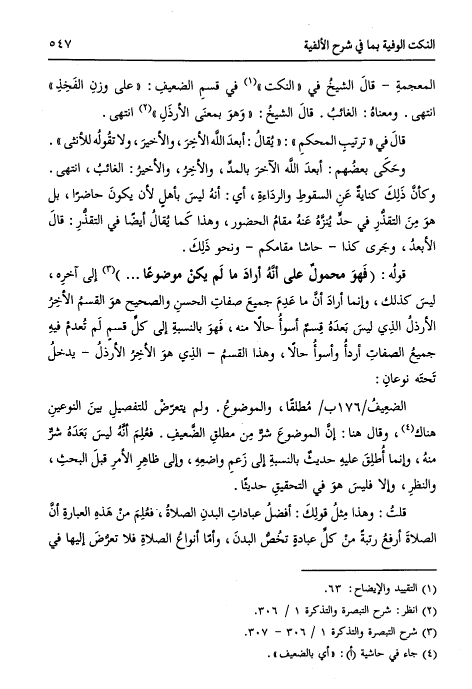 قولُهُ: (فَهوَ محمولٌ على أنَّهُ أرادَ ما لَم يكنْ موضوعاً ... ) (¬3) إلى آخرهِ، ليسَ كذلك، وإنما أرادَ أنَّ ما عَدِمَ جميعَ صفاتِ الحسنِ والصحيح هوَ القسمُ الآخرُ الأرذلُ الذِي ليسَ بَعدَهُ قِسمٌ أسوأُ حالاً منه، فَهوَ بالنسبةِ إلى كلِّ قسمٍ لَم تُعدمْ فيهِ جميعُ الصفاتِ أردأُ وأسوأُ حالاً، وهذا القسمُ - الذِي هوَ الآخرُ الأرذلُ - يدخلُ تَحتَه نوعانِ:
