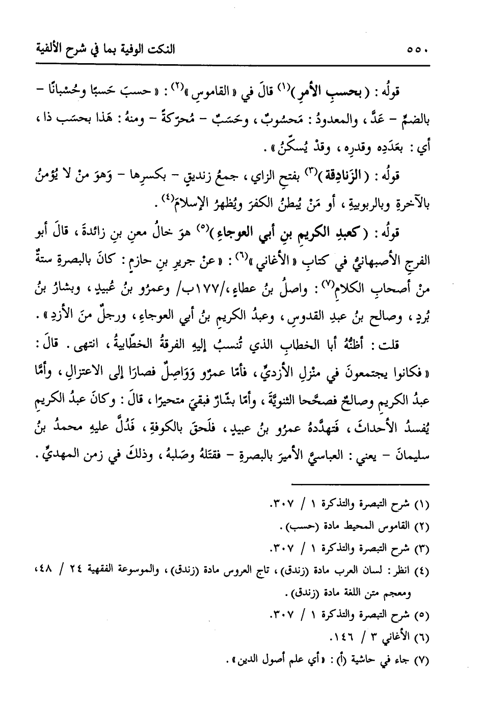 قولُهُ: (كعبدِ الكريمِ بنِ أبي العوجاءِ) (¬5) هوَ خالُ معنِ بنِ زائدةَ، قالَ أبو الفرجِ الأصبهانيُّ في كتابِ "الأغاني" (¬6): ((عنْ جريرِ بنِ حازمٍ: كانَ بالبصرةِ ستةٌ منْ أصحابِ الكلامِ (¬7): واصلُ بنُ عطاءٍ، / 177ب / وعمرو بن عُبيدٍ، وبشارُ ابنِ بُردٍ، وصالح بنُ عبدِ القدوسِ، وعبدُ الكريمِ بنُ أبي العوجاءِ، ورجلٌ منَ الأزدِ)).